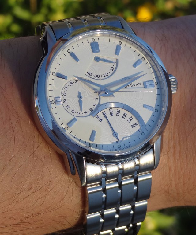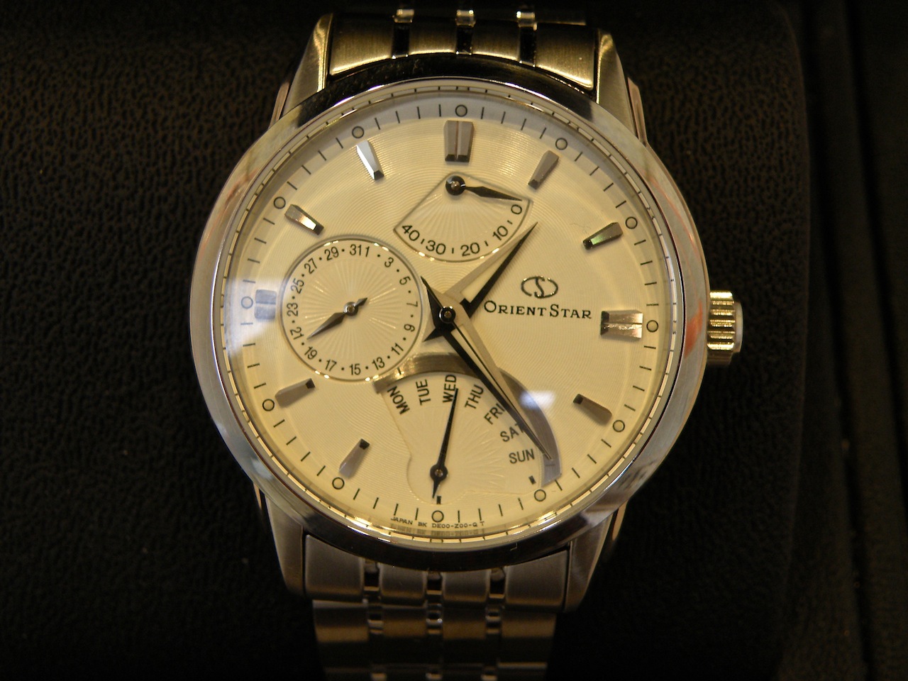 Продам часы ORIENT Star Retrograde 100% оригиналы, состояние - как на полке магазина. Механизм часов Orient Star Retrograde калибра 40A50 изготовлен самим производителем Orient, он имеет 40-часовой запас хода и кроме основной функции – времени, обеспечивает энергией три показателя: день недели (находящийся в направлении на 6 часов), число месяца (в направлении на 9 часов) и индикатор запаса хода (на 12 часов). Логотип Orient Star украшает циферблат в направлении на 3 часа, создавая эффект пропорциональности. Корпус изготовлен из нержавеющей стали шириной 39,5 мм и толщиной 14,25 мм. Циферблат мужских часов Orient Star имеет стальные часовые маркеры и стрелки, покрытые качественным люминесцентным составом. Все это защищено сапфировым стеклом, имеющим антибликовое покрытие с внутренней стороны, кстати, задняя крышка также изготовлена из сапфира и является панорамным окном, открывающим великолепный вид на работу механизма. Точность хода - просто огонь!!!! +/- 5 секунд в месяц, замерял сам. Комплектация: часы, коробка, международная гарантия на 2 года, запасные звенья браслета. Цена в Аквамоле г.Ульяновска - 42000 руб. Небольшой торг.