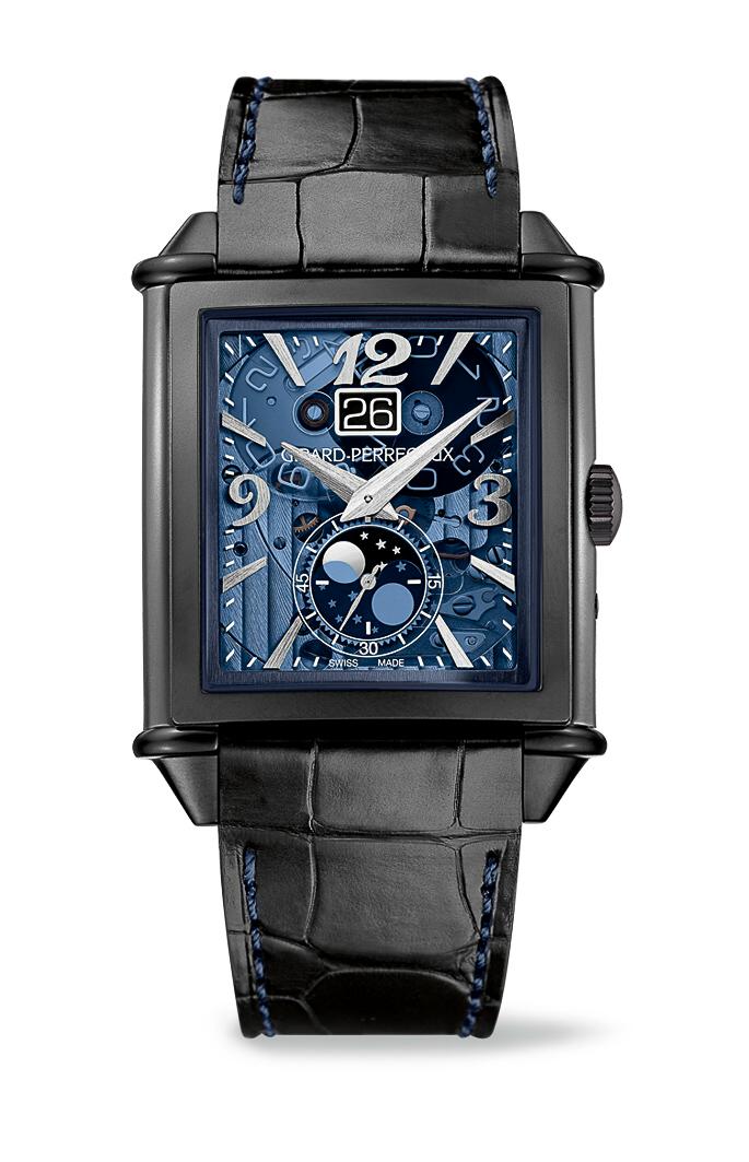 Слегка изогнутый полированный прямоугольный корпус, изготовленный из титана с черным DLC-покрытием, водонепроницаемый до 30 метров. Рифленая заводная головка расположена на 3 часах, на ее торце выгравирован логотип бренда Girard-Perregaux. Сапфировое стекло установлено на лицевой стороне корпуса (с антибликовым покрытием) и на его завинчивающейся задней крышке (на последнюю нанесена надпись: "Unique Piece - Only Watch 2015"). Прозрачный поликристаличный циферблат с голубым тонированием циферблат, с сатинированными стальными накладными арабскими цифрами, часовыми индексами и стрелками.