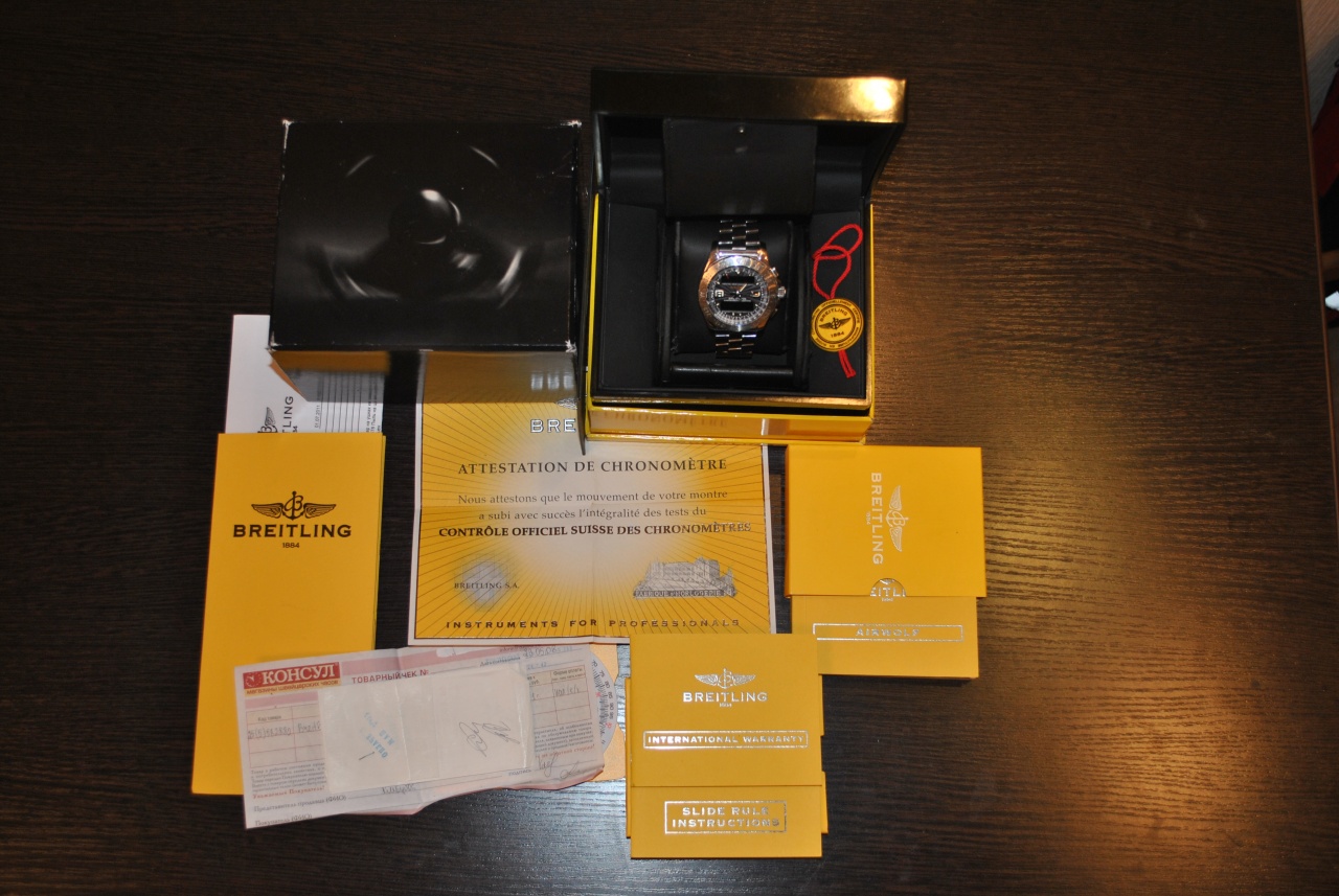 Комплектность полнейшая: со всеми коробками (внешний картонный, внутренний металлический и кожанный футляр для путешествий), всеми сертификатами, гарантией, репассажем у официалов в 2011, включая кассовый и товарный чек за покупку в 2008 в Консуле.