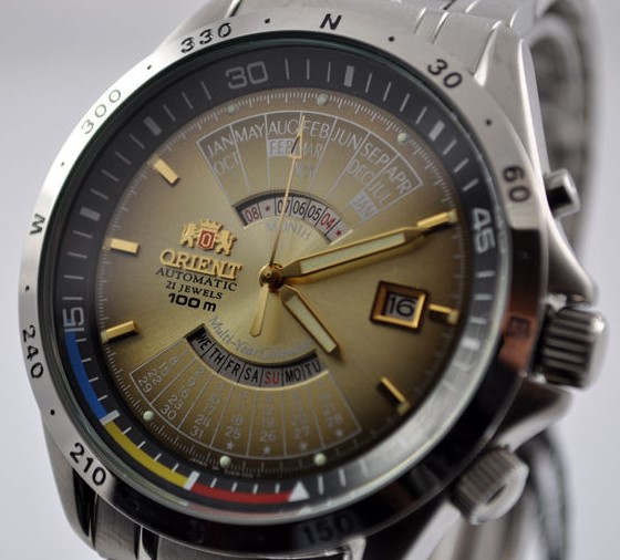 Предлагаю вашему вниманию к продаже культовую модель часов на браслете ORIENT Multi-Year Calendar Automatic-MADE in JAPAN.Часы на отличном ходу,полностью исправны.Почищены и смазаны.Водозащита -100м.Корпус и браслет из нержавеющей стали.Есть незначительные следы от носки на корпусе и браслете,но ничего критичного.Стекло минеральное,на отметках 7 минут и 12 минут имеются малейшие коцки,видные под определенным углом.Подробные характеристики: