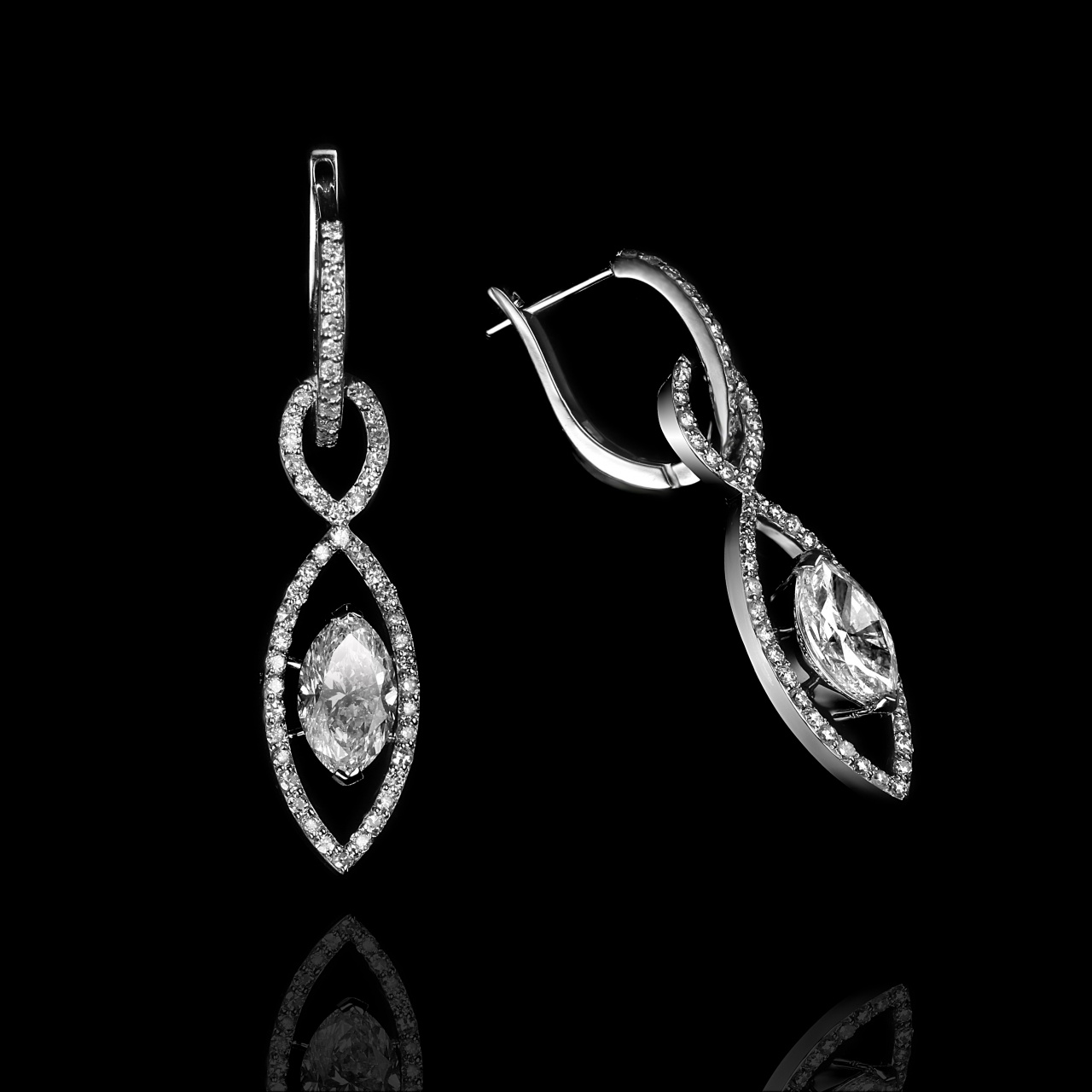 Бриллианты в серьгах: огранка "Маркиз", вес 0.76 карат, цвет F (3), чистота SI2 (7a) + вес 0.88 карат, цвет G (4), чистота SI1 (6)