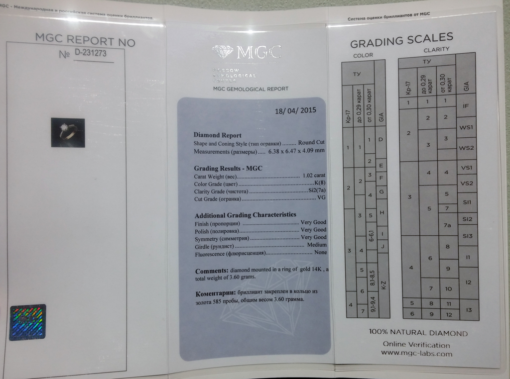 ~~~Кольцо из желтого золота с бриллиантом 1,02 карат (сертификат МГЦ)~~~