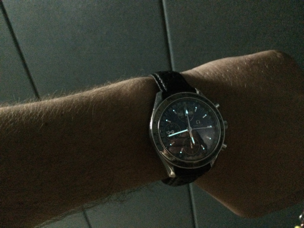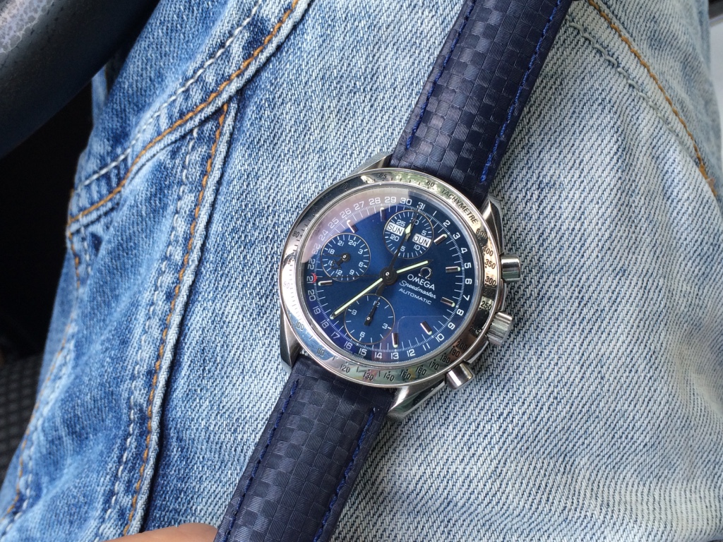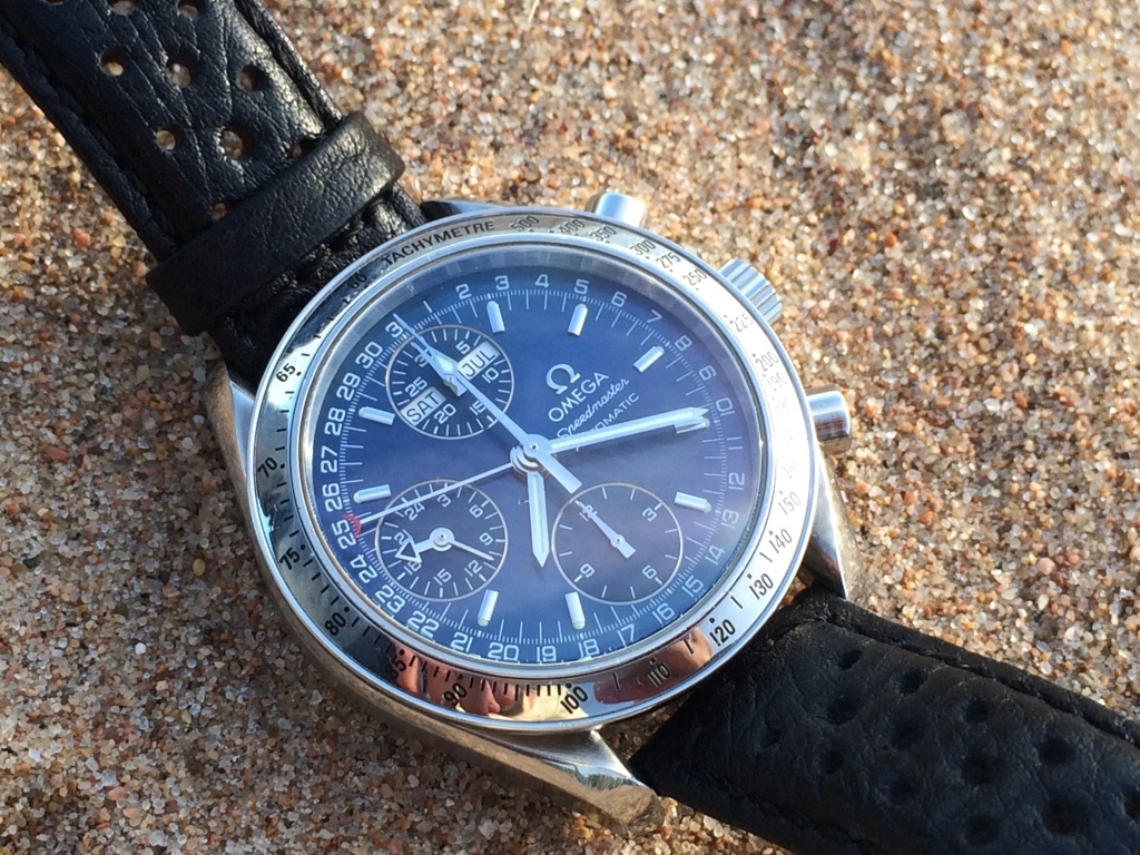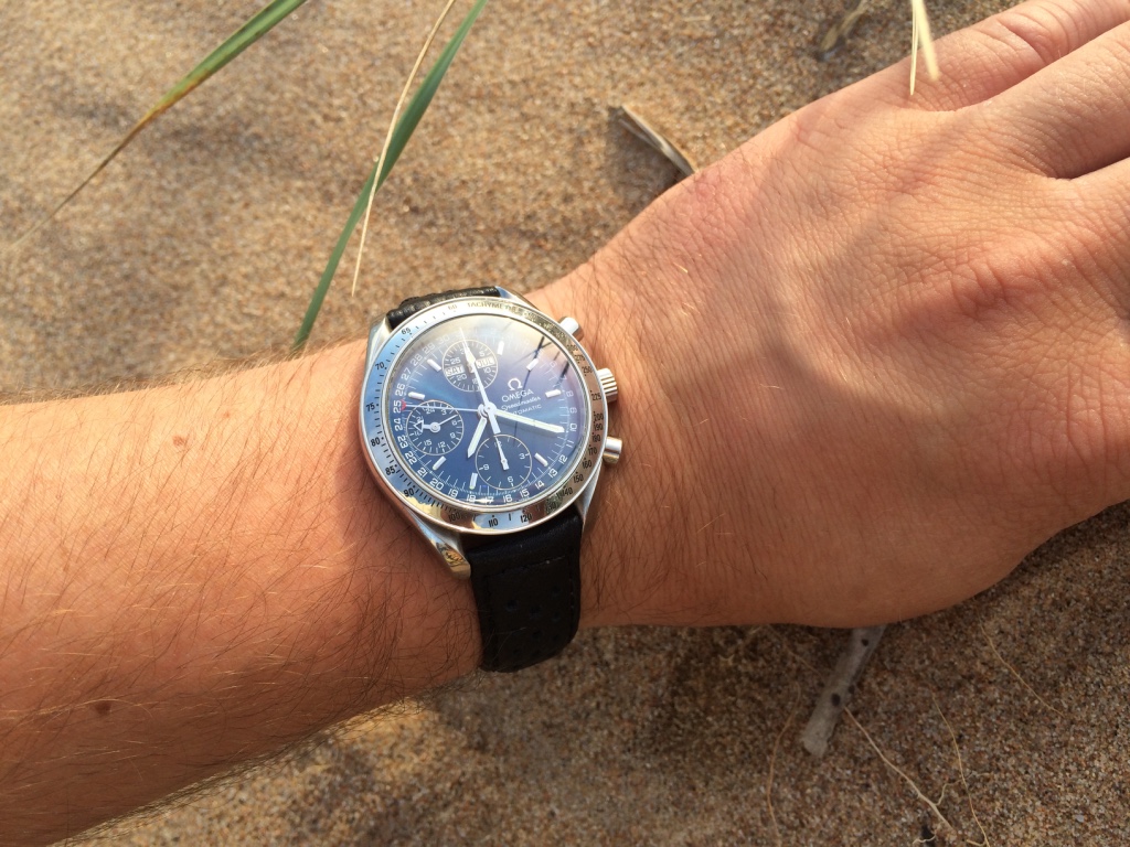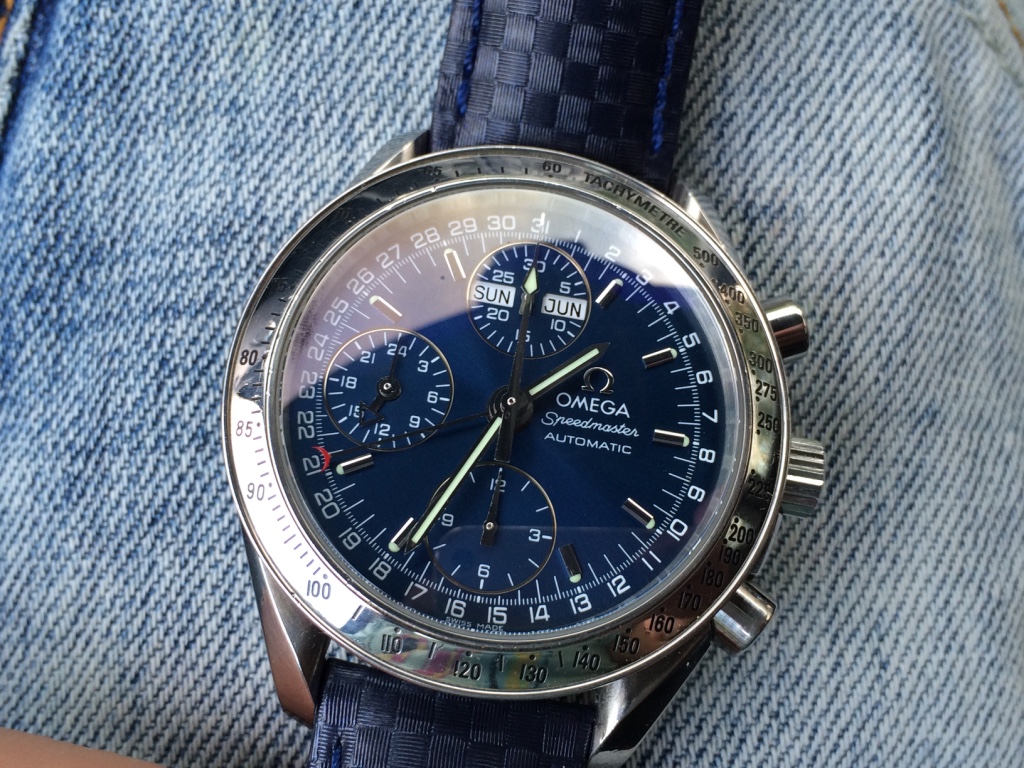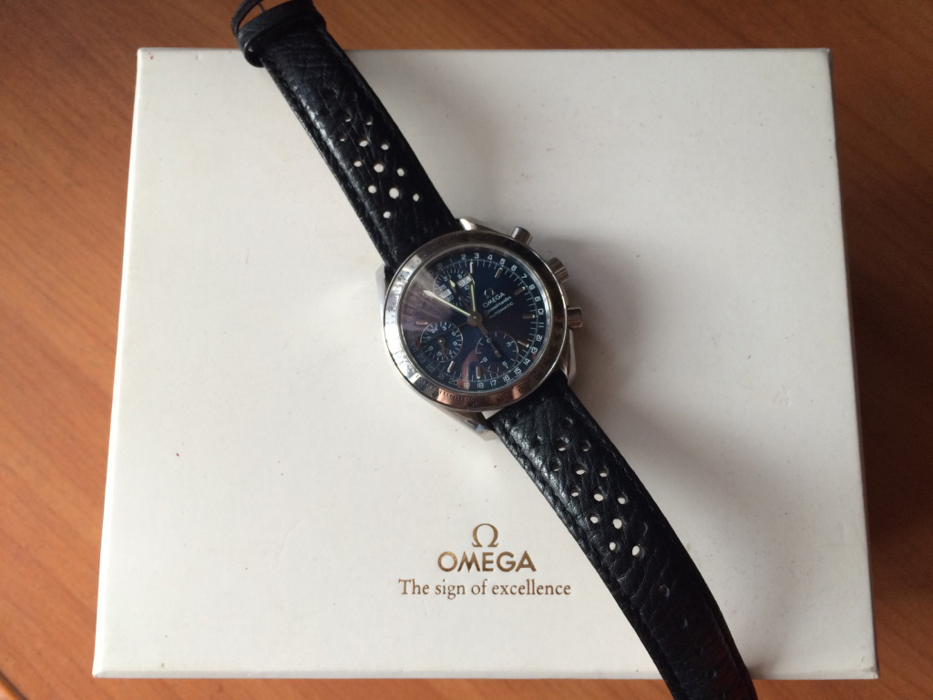 Часы Omega Speedmaster, легендарная серия у Омеги, очень красивые и редкие часы в такой версии. Циферблат меняет глубину цвета в зависимости от освещения, в паре с антибликом смотрится шикарно.