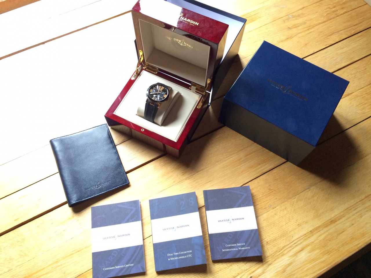 Упаковочная темно-синяя коробка, деревянная коробка, документы:Customer Service International Warranty, Customer Service Centers, Dual Time Collection & Michelangelo UTC, темно-синий кожанный кошелек Ulysse Nardin.