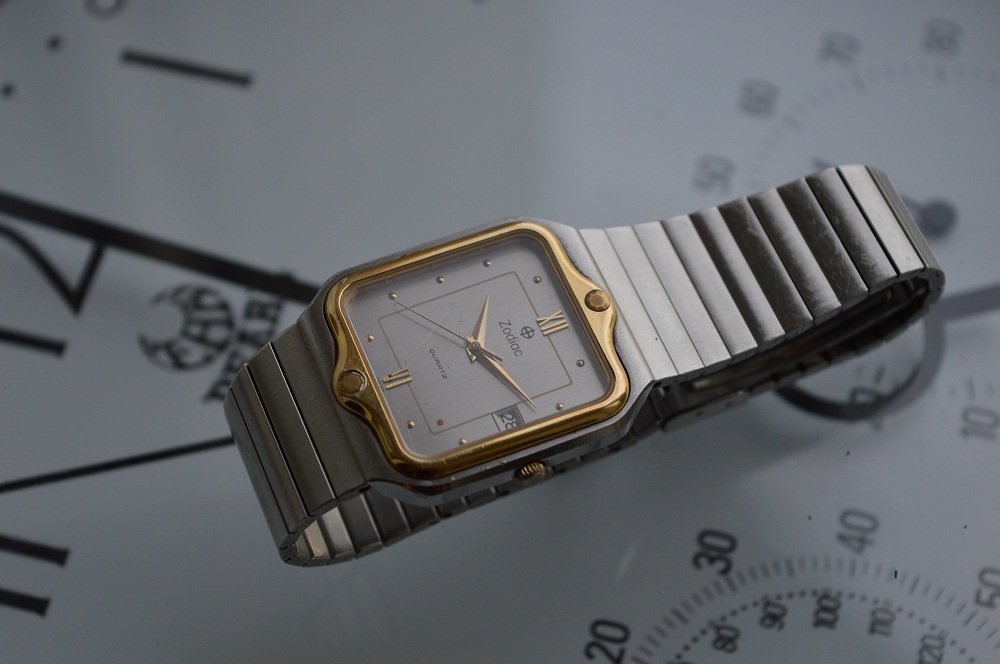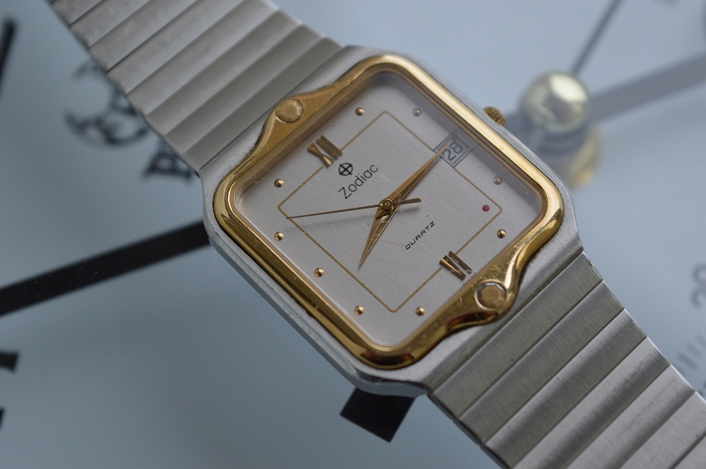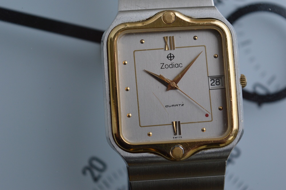 В продаже редчайший винтажный Zodiac из начала 80-х. Созданы в лучших традициях марки в дофоссиловский период как классический вариант для повседневной носки. 100% оригинал, надежный кварцевый механизм, окно даты, очень удобно облегающий руку оригинальный браслет ( до 19 см запястье), р-р 34х36, смотрятся крупно.