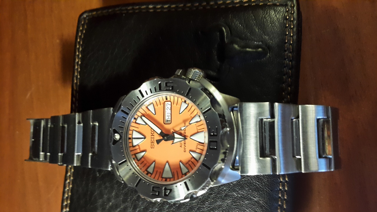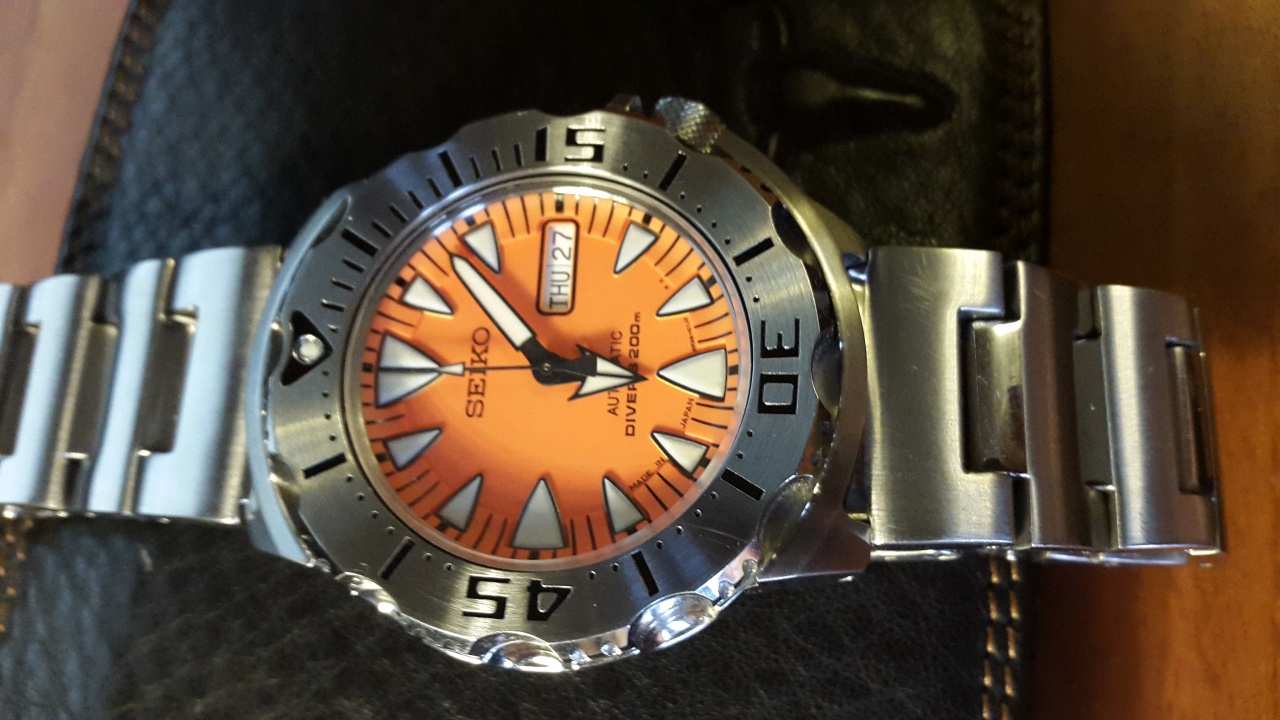 Seiko Monster SRP309J1. Made in Japan. покупались тут новыми в мае 2015. Ходят достаточно точно - при постоянном ношении около -5 сек в сутки. есть небольшие царапки на безеле - между 7 и 8 часами на фото (спецом сфоткал, так не заметно). на стекле если очень очень сильно приглядываться есть царапина тоже. браслет укорочен, звенья в наличие. причина продажи - новое хотение)))