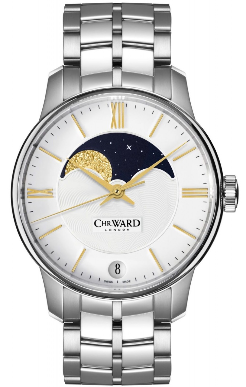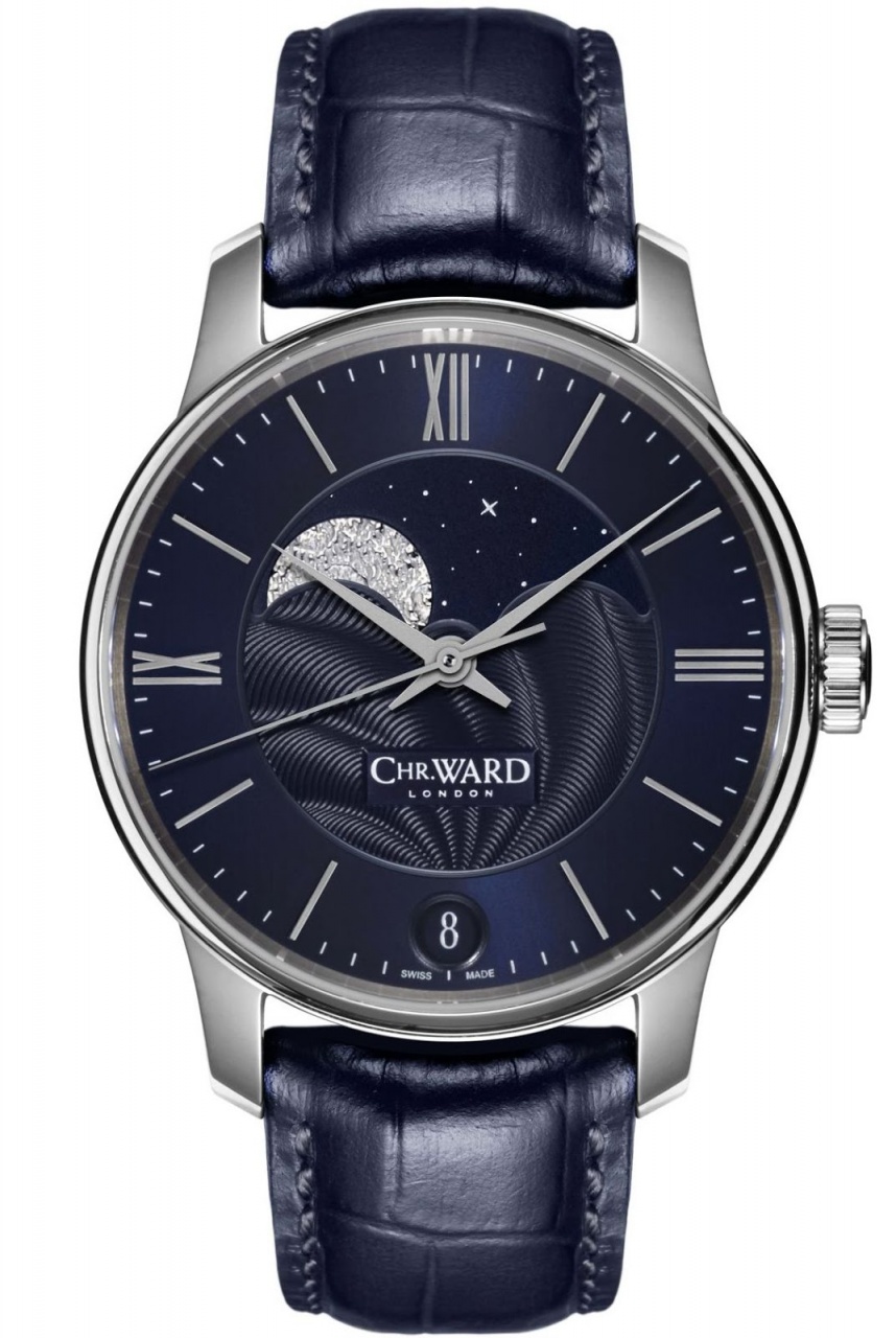 Британская часовая компания Christopher Ward, выпускающая свои часы в Швейцарии, представила свою новую модель C9 Moonphase (40mm), которая выпускается в двух вариантах: с циферблатом белого цвета с золотым PVD-покрытием часовыми индексами и стрелками, а также с циферблатом темно-синего цвета с никелированными часовыми индексами и стрелками.