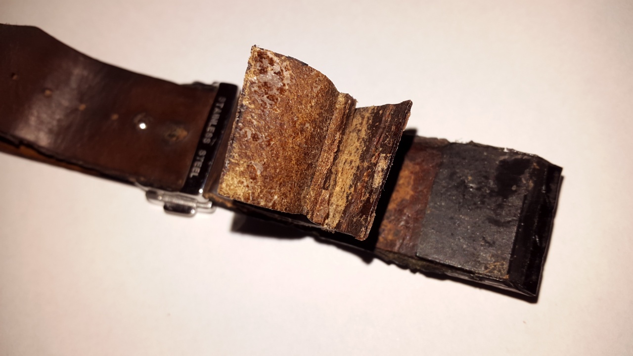 Постепенно ремешок выходил из строя - появилось расслаивание. И оно усиливалось. Попытался лечить секундным клеем на скорую руку. Эффект был не очень. В общем, как заметил Брусницын, "ремень изношен на 100%!!!")))