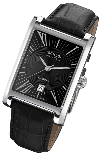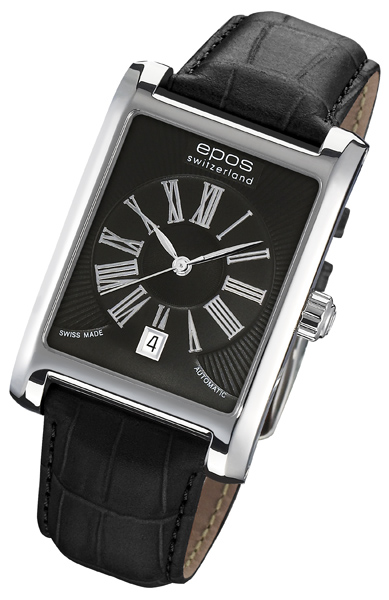 Mechanical self-winding movement ETA 2824-2 or SW 200, decorated. Date indication. Stainless steel case with domed sapphire crystal, also available in PVD rose. Screwed see-through back. Water resistant to 50 m. Guilloché decorated black dial with applied roman figures. Screwed-on leather strap.