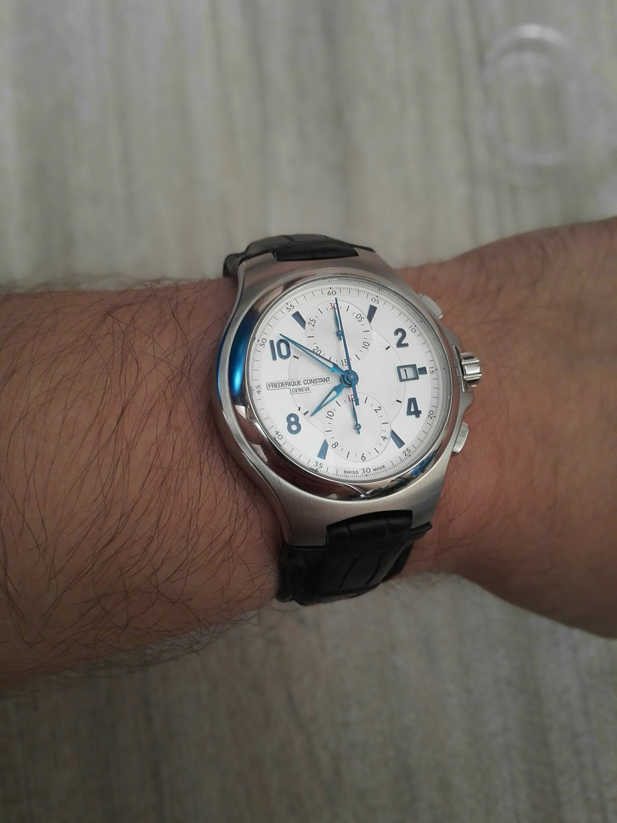 Автоматический механизм калибр FC-393 (25 камней, запас хода 42 ч, частота полуколебаний баланса 28800 полуоб/час.). Автоподзавод. Механизм - модификация Sellita SW500, аналог Valjoux 7750.