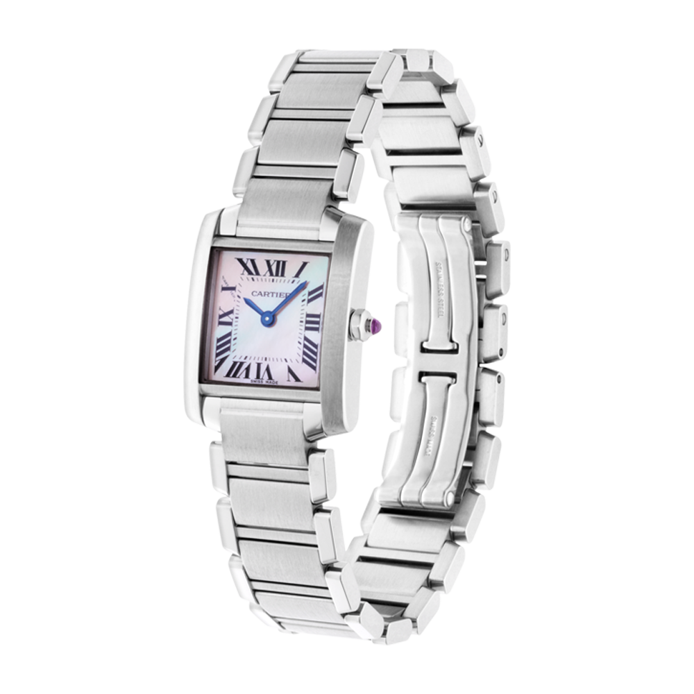 Часы Tank Française, маленькая модель, кварцевый механизм, калибр Cartier 057. Корпус из стали, восьмигранная заводная головка украшена синтетической шпинелью в форме кабошона, циферблат из розового перламутра, стрелки в форме мечей из вороненой стали, сапфировое стекло, браслет из стали, тройная раскладывающаяся застежка из стали. Размеры корпуса: 25,35 х 20,30 мм. Высота корпуса: 5,94 мм. Водонепроницаемость до 30 метров.
