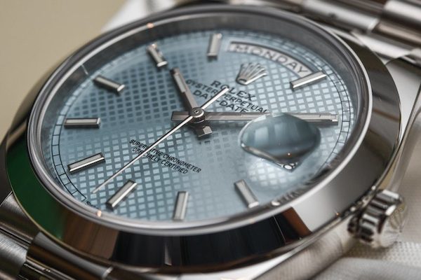 Предлагаю уважаемому сообществу только начинающий появляться у дилеров платиновый Day-Date диаметром 40 мм, с преобразованным механизмом калибра 3255 и новой разновидностью циферблата завораживающего цвета Ice blue, diagonal motif.