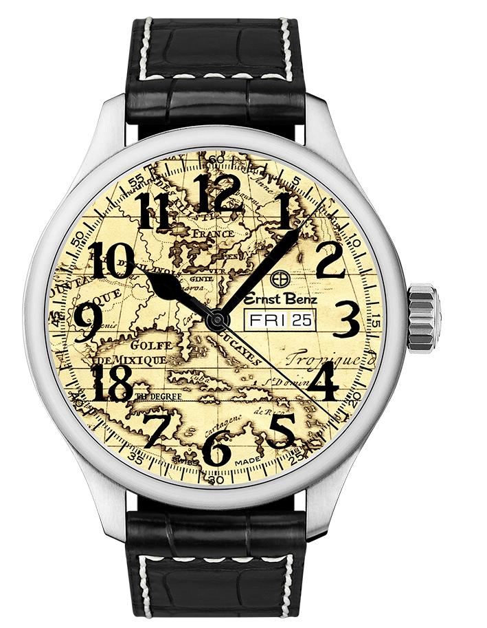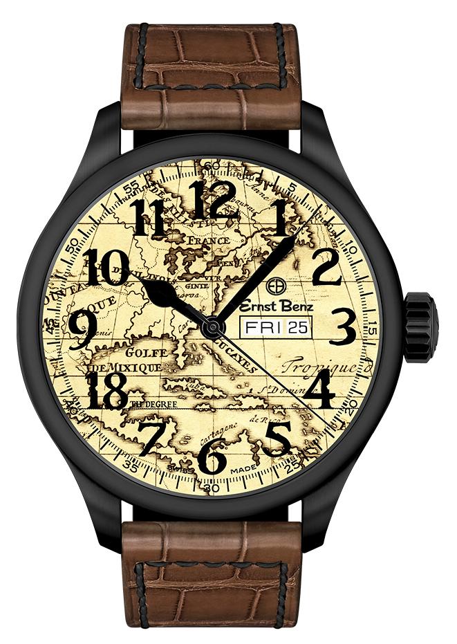 Круглый корпус 18th Degree Chronosport, диаметром 44 мм или 47 мм, водонепроницаемый до 50 метров. На торце рифленой заводной головки, расположенной на 3 часах, выгравирован логотип бренда Ernst Benz. Сапфировое стекло установлено на передней стороне часового корпуса (с антибликовым покрытием) и на его задней крышке. Циферблат выполнен в виде исторической карты XVII века с изображением Северной и Центральной Америки с бассейном Карибского моря со специально выделенной 18-ой параллелью северной широты, которая соединяет в восточной части Карибского моря St. Thomas, St. Maarteen, St. Baarths и Puerto Rico, а также Jamaica, Belize и Mexico - в западной его части. Арабские цифры и стрелки выполнены в черном цвете.