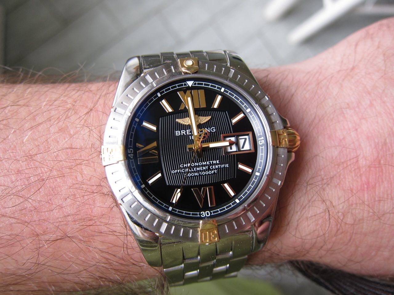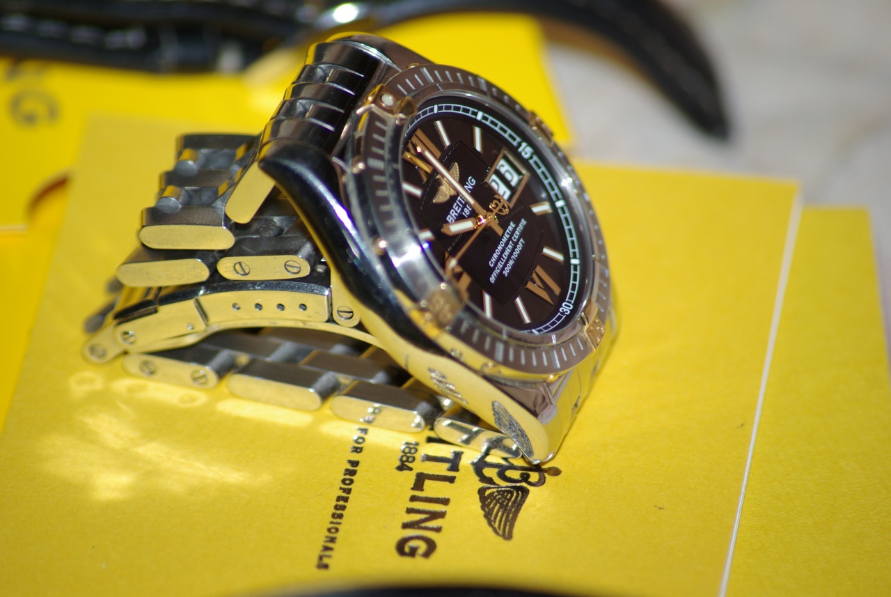 Часы Windrider Cockpit в представлении не нуждаются. Одна из самых красивых моделей Breitling. Полный комплект коробок и документов. 2 года назад прошли репассаж у официантов на Бутырском Валу, есть все бумаги и подарочная коробочка "переноска" из сервиса. Ход точный, в пару секунд укладываются. В комплекте есть и оригинальный кожаный ремень и стальной браслет. Ремень уже видавший виды (сама кожа, застежка в прекрасном виде).