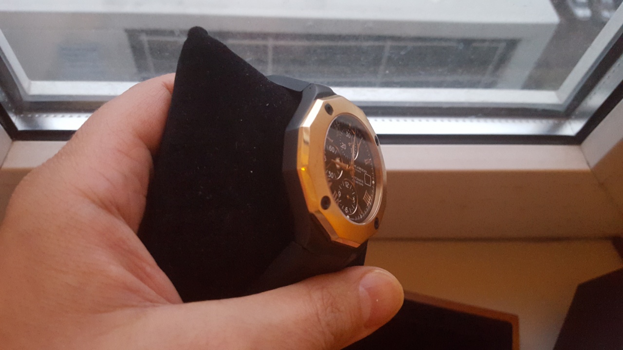 Состояние часов очень приличное - ближе к отличному - незначительные следы носки, заметные на золоте в виде волосковых царапин. ПВД в отличном состоянии, каучук подрезан на нормальную, немаленькую руку. В комплекте оригинальный бокс, мануал, карточка.