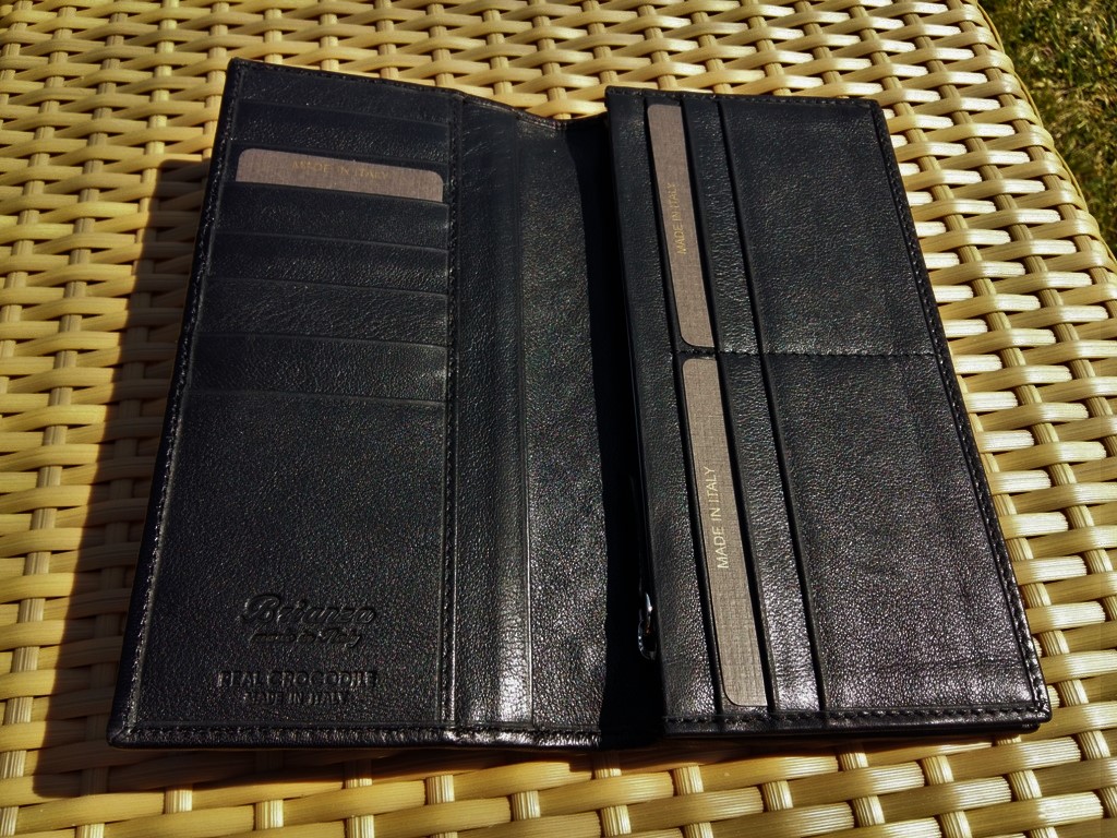 Портмоне имеет четыре больших отделения для банкнот (рубли, евро, доллары), отделение для хранения мелочи, застегивающееся на молнию, и 13 (тринадцать) отделений для кредитных карт или визиток. Внутри портмоне отделано телячьей кожей черного цвета.