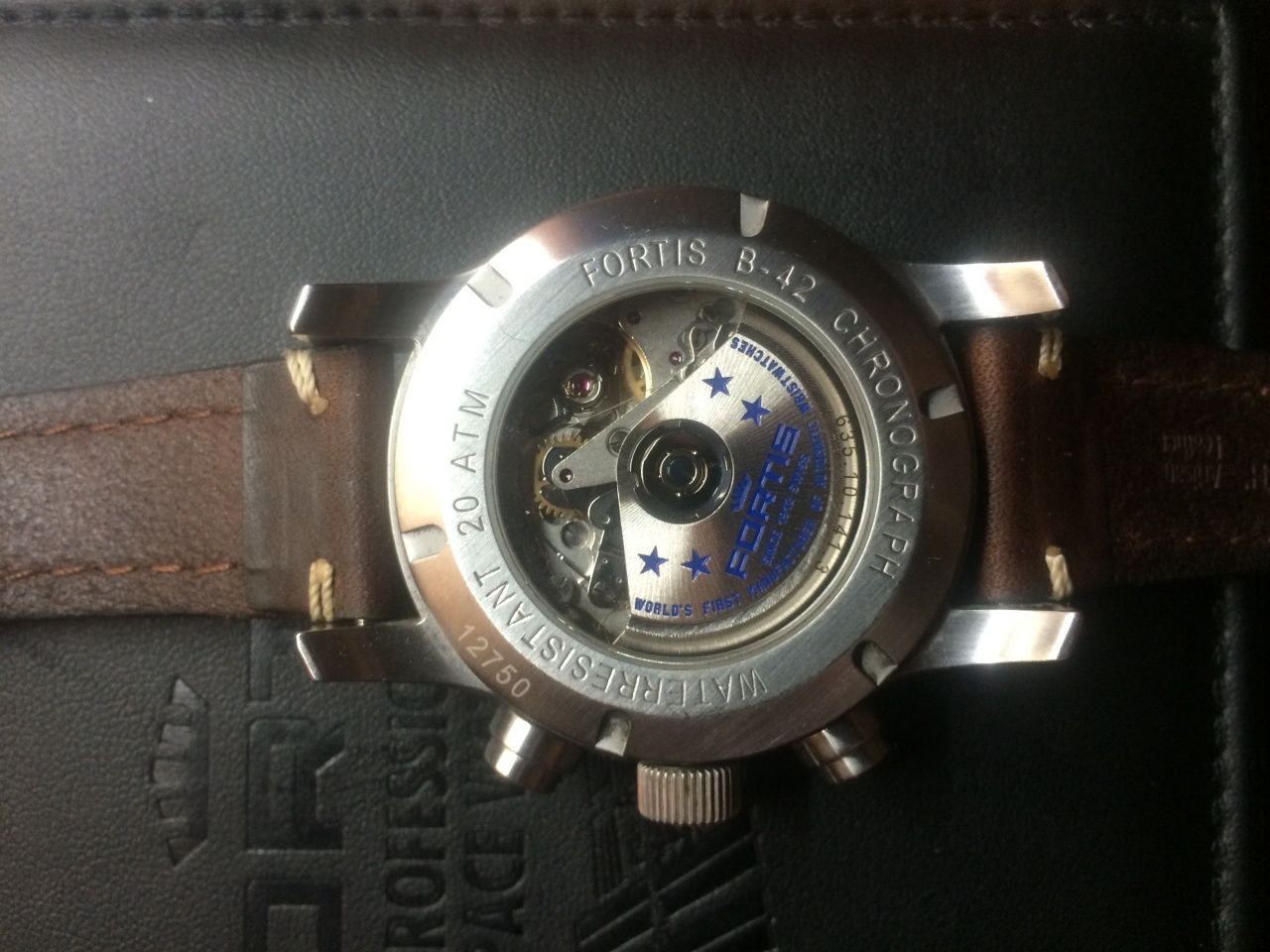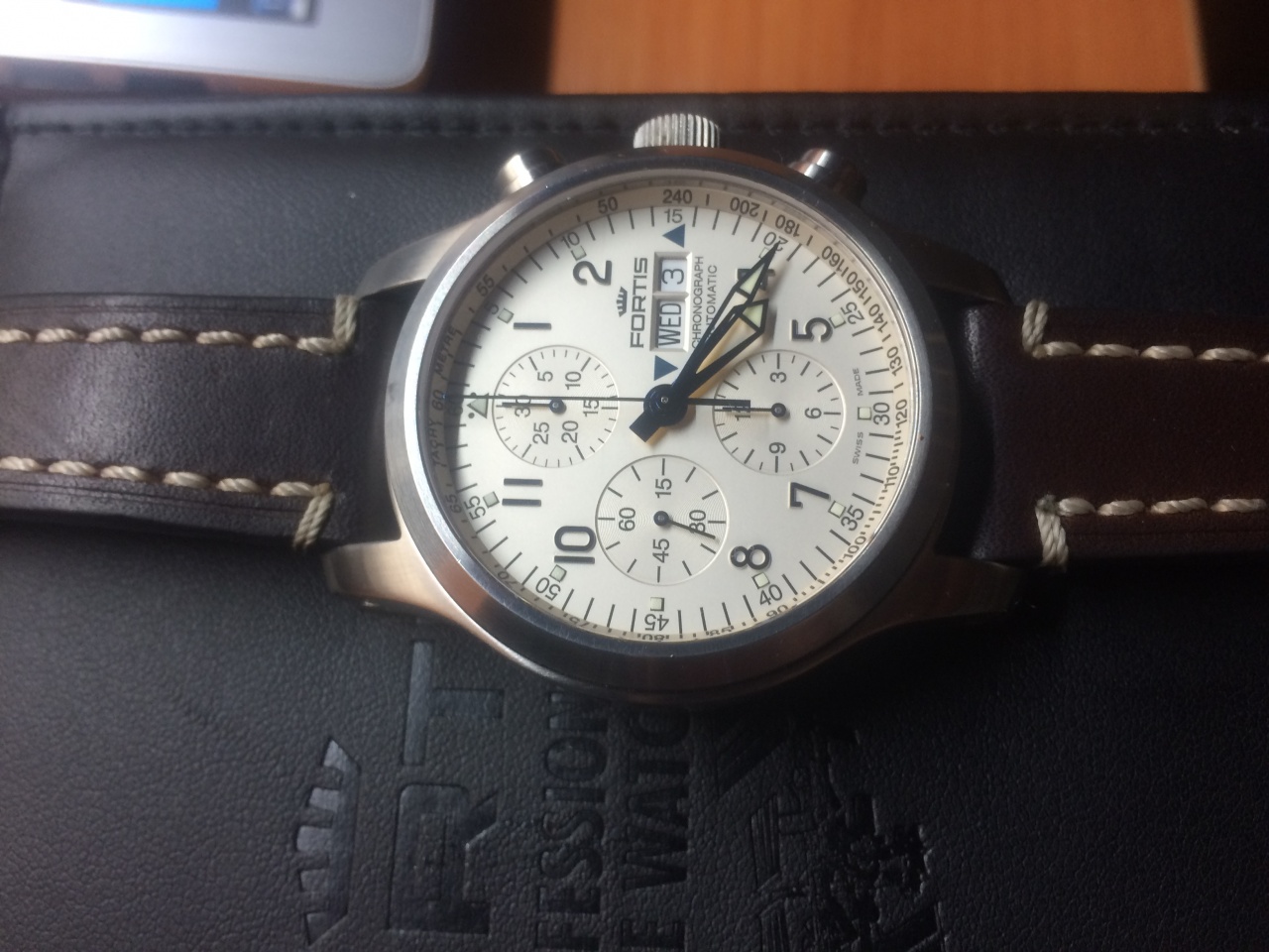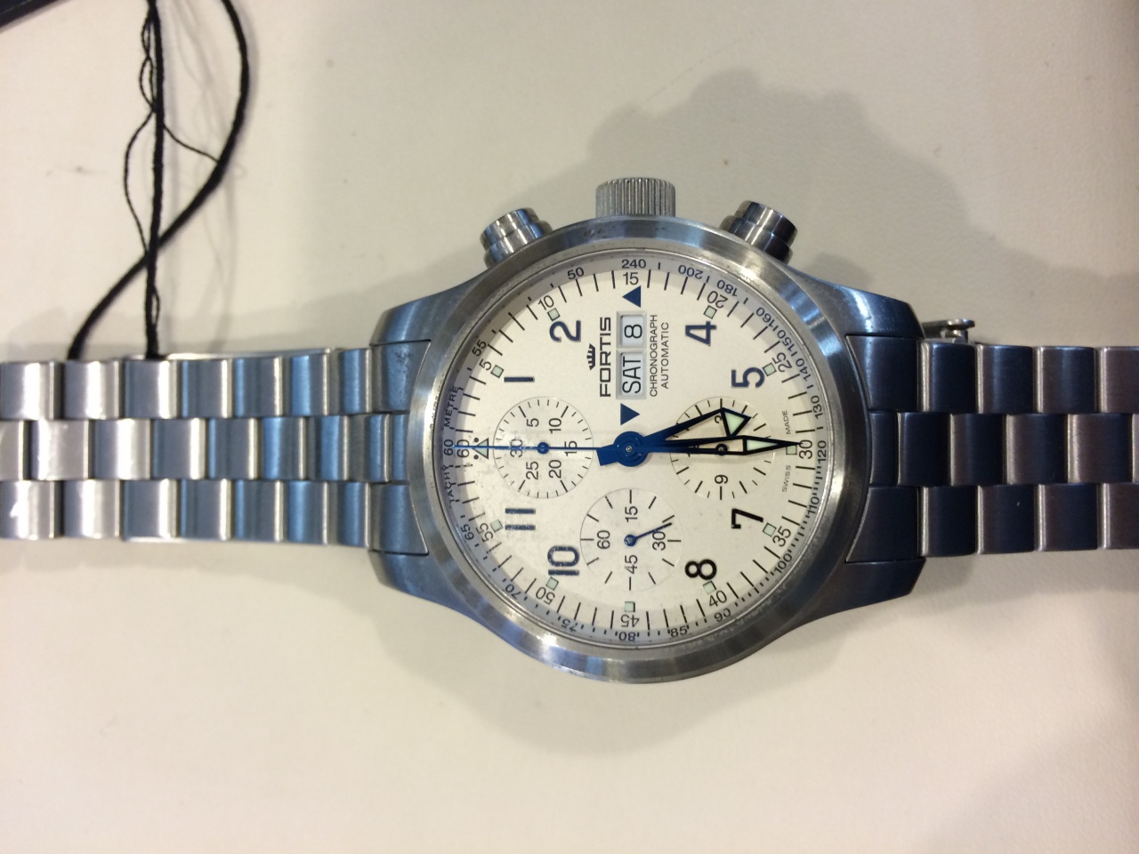 Продам мужской хронограф Fortis. Автоматический механизм ЕТА 7750 Valjoux (25 камней; 28800 полуколебаний/час; запас хода 44 часа; обод баланса Glucydur; спираль баланса Nivarox; противоударное устройство оси баланса Incabloc). Автоподзавод. Маленькая секундная стрелка. Окошко даты. • Корпус из высококачественного стального сплава 316L с высокими антикоррозийными свойствами. Диаметр корпуса 42 мм. • Сапфировое стекло устойчивое к царапанию с двусторонним антибликовым покрытием. Стрелки и индексы со светонакопителем Super-Luminova. Часы на кожаном ремне от Hirsch, но оригинальный браслет в наличии. Часы красивые и внушительные, накладные воронёные цифры и циферблат цвета слоновой кости. носил бы и носил, но - кризис!