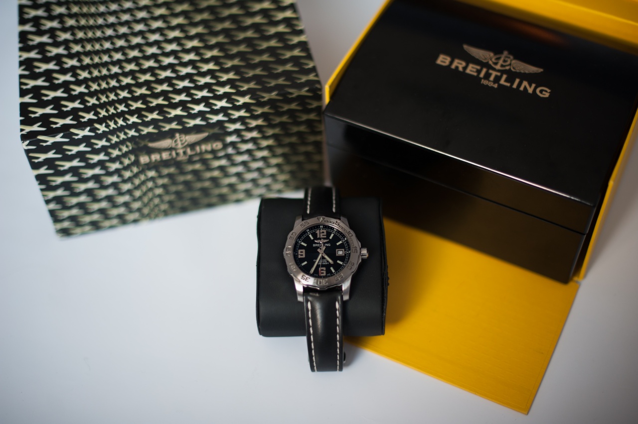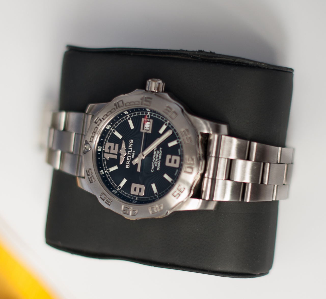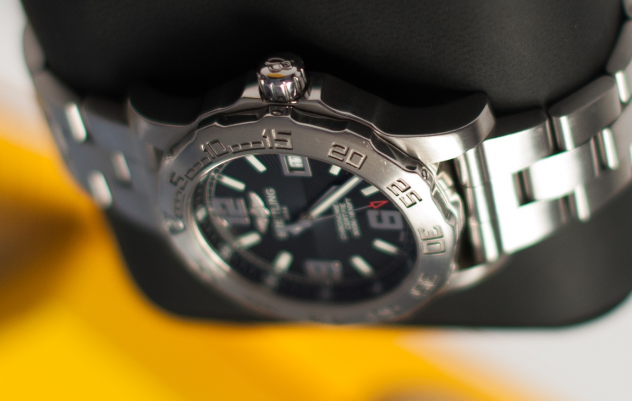 Черный циферблат "VOLCANO BLACK", двойное антибликовое покрытие, идеальный размер 44 мм, водозащита 500 метров, SuperQuartz Caliber 74 от BREITLING, точность COSC (отклонение не более 5 секунд в год), срок службы батареи до 8 лет.