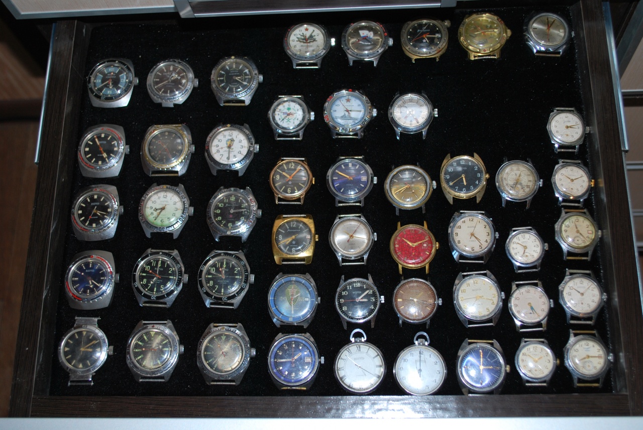 56шт.: Maurice Lacroix, Epos, Bulova, Seiko, Orient (3), Citizen, Armani, Океан, Авиатор, Полет (3), Родина, Спутник, Урал, Восток (6), Ракета (13), Слава (4), Чайка (3), ЗиМ, Победа, Заря (2), Луч, Дружба, Молния и тд... Два года скромного хобби