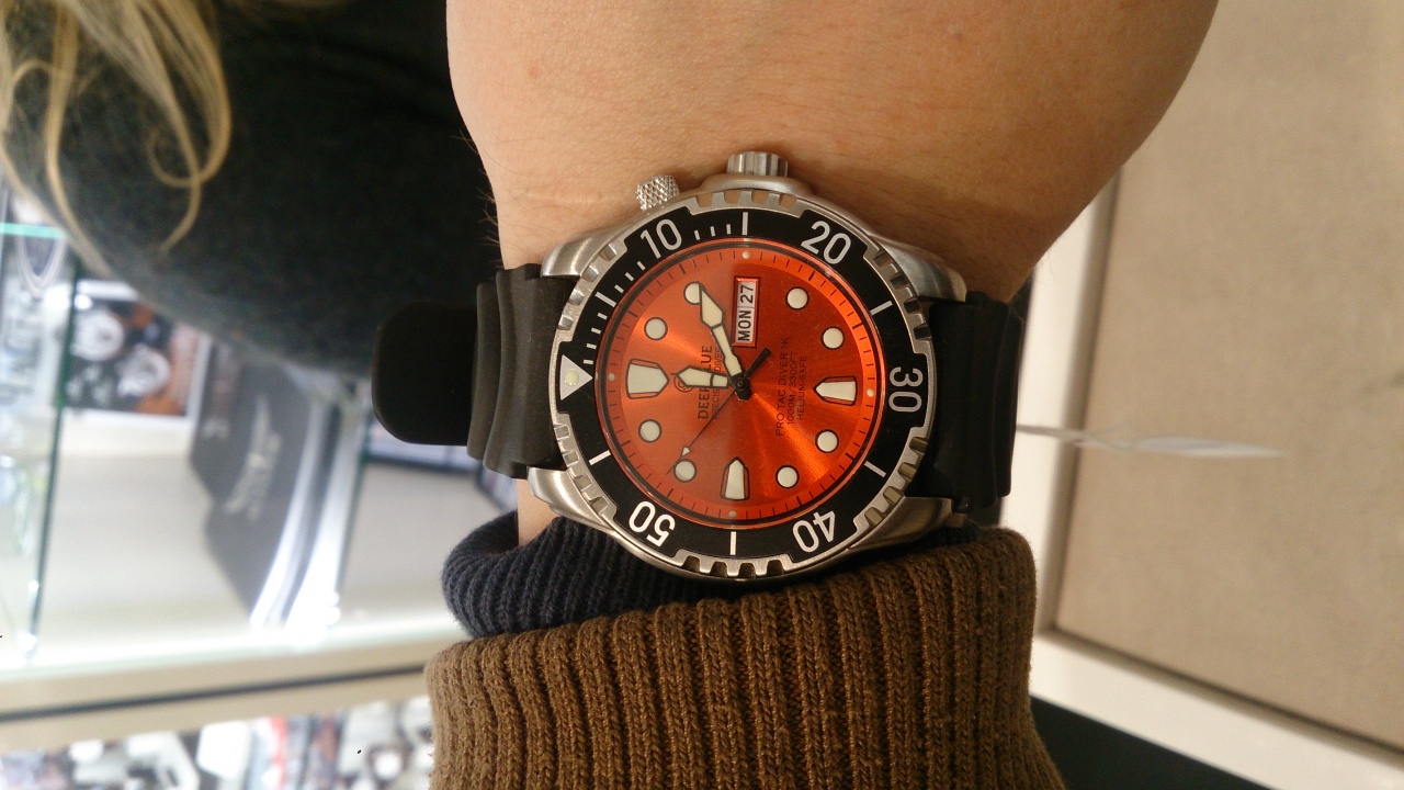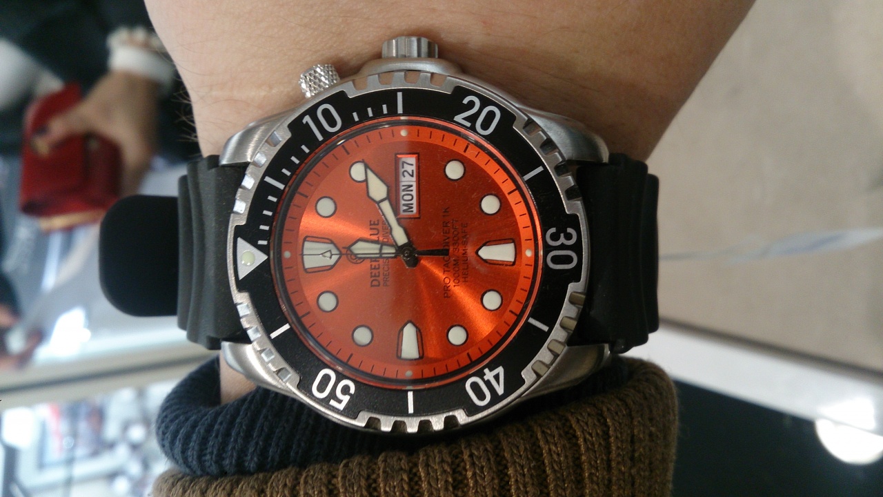 Ну что же...Посмотрел я на Deep Blue.Впечатление двоякое. С одной стороны,все вроде в норме, вполне себе часы,на мой неискушенный взгляд. Что не понравилось: на sea ram 500 достаточно тугой безель, крутить его сложно,они автомат,вес приличный, люм нанесен каким- то очень сложным механизмом, в названии которого явно есть слово НАНО. Честно! Очень тонкий слой.Если память не изменяет, то там Суперлюминова С1... Вообщем сомнения насчет люма есть большие.А самое главное, это оранжевые стрелки...Слишком кричащие, как мне показалось.Хочется немного поспокойнее что ли. Старею наверное))). Что характерно!!! Более дешевая модель pro tac diver понравилась больше.Безель хоть и имеет незначительный люфт,но сам вращается очень приятно,вес за счет кварца и силикона очень приятный.Гелиевый клапан,игрушка,которую мне было страшно сломать)...Открутил,а когда назад решил ввернуть, то он не спервого раза на резьбу попал, хотя делал я все предельно аккуратно. Цвет циферблата,как ни странно понравился,хотя я и писал выше,что хотел бы вариант поспокойнее.Если нужен оранжевый циферблат, то это отличный вариант!!! Люма кстати там в разы больше и если чуть прикрыть ладошкой,то он начинает светить.Понятно,что часы по лампами витринными стоят,но вот на sea ram и этого не было.Как-то так.Мнение - нормальные часы.Немного ярковаты, из-за чего на душу не легли.Кстати глянул модель, название не вспомню, но знающие форумчане поймут...Хрон с глубиномером.Даже фотками не стал- опять ядовито оранжевая стрелка,хрон работает странно...То есть нужно отвинтить ЗГ отвечающую за хрон,но когда ее откручивашь, кнопка так глубоко уходит в эту ЗГ,что нажать ее становится ну пипец трудно.То есть, каждый раз чтобы воспользоваться придется поизвращаться, что напрочь отобьет желание им пользоваться.