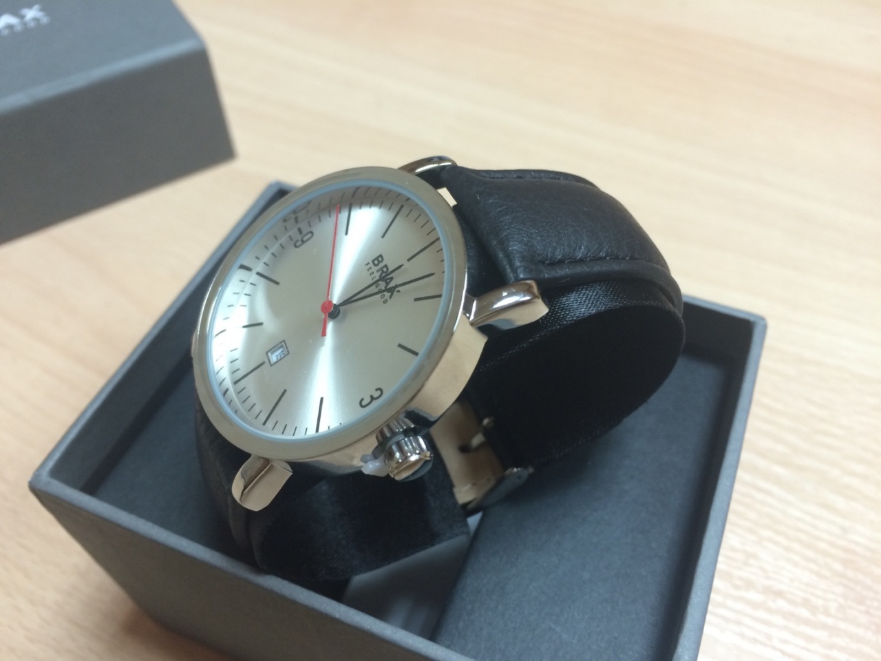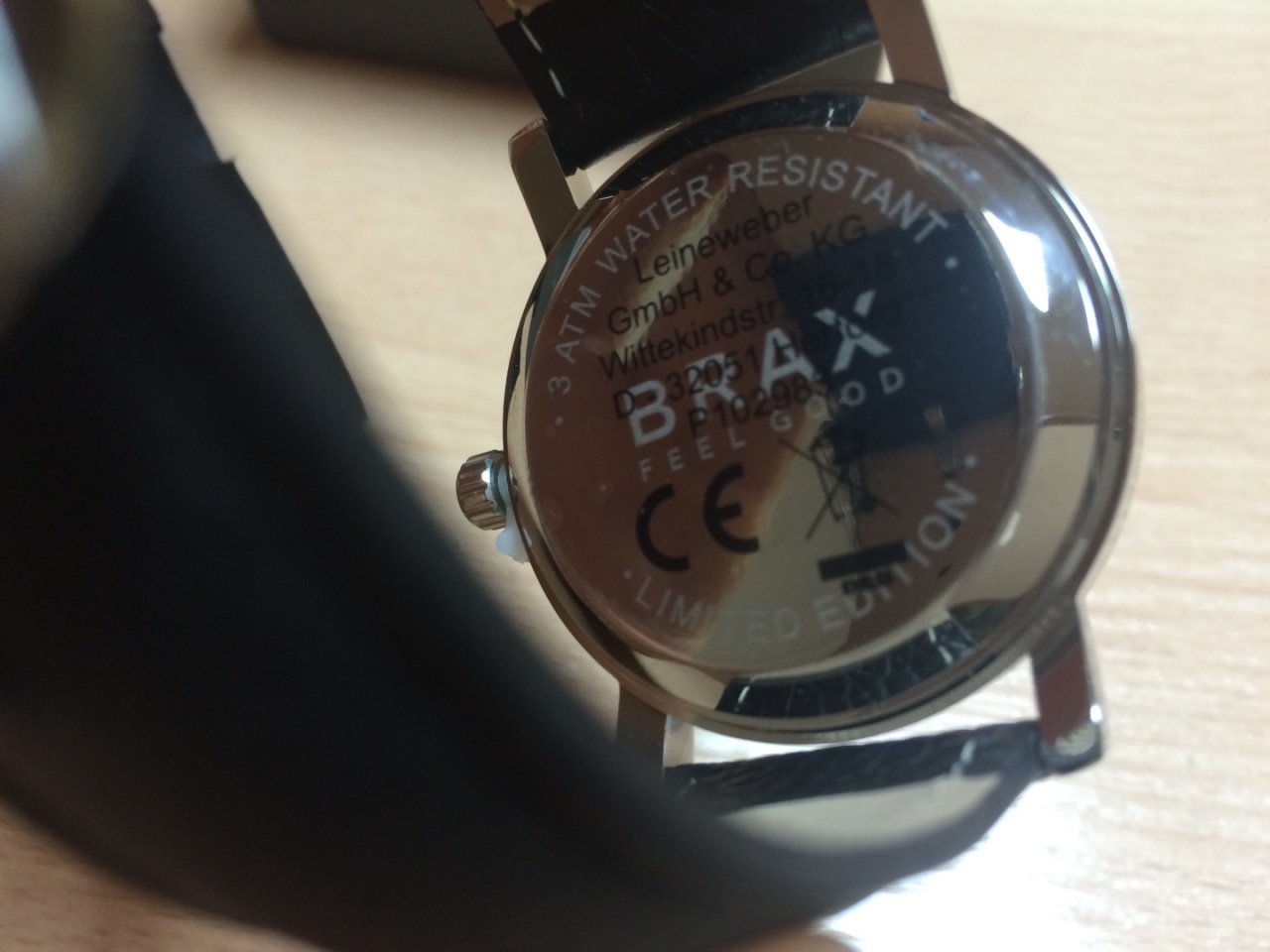Новые часы фирмы Brax, достались по акции. Немецкие наручные часы для мужчин с отображением даты. Часы в стальном круглом корпусе на черном кожаном ремешке. Серебристый циферблат. Часы выпущены ограниченным тиражом (Limited Edition) к юбилею немецкой фирмы BRAX (слоган - Feel Good) в 2013 году. В свободной продаже не встречала.