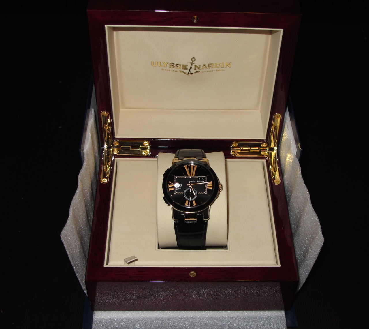 Ремешок: черный крокодил, золотая браслетная застежка.