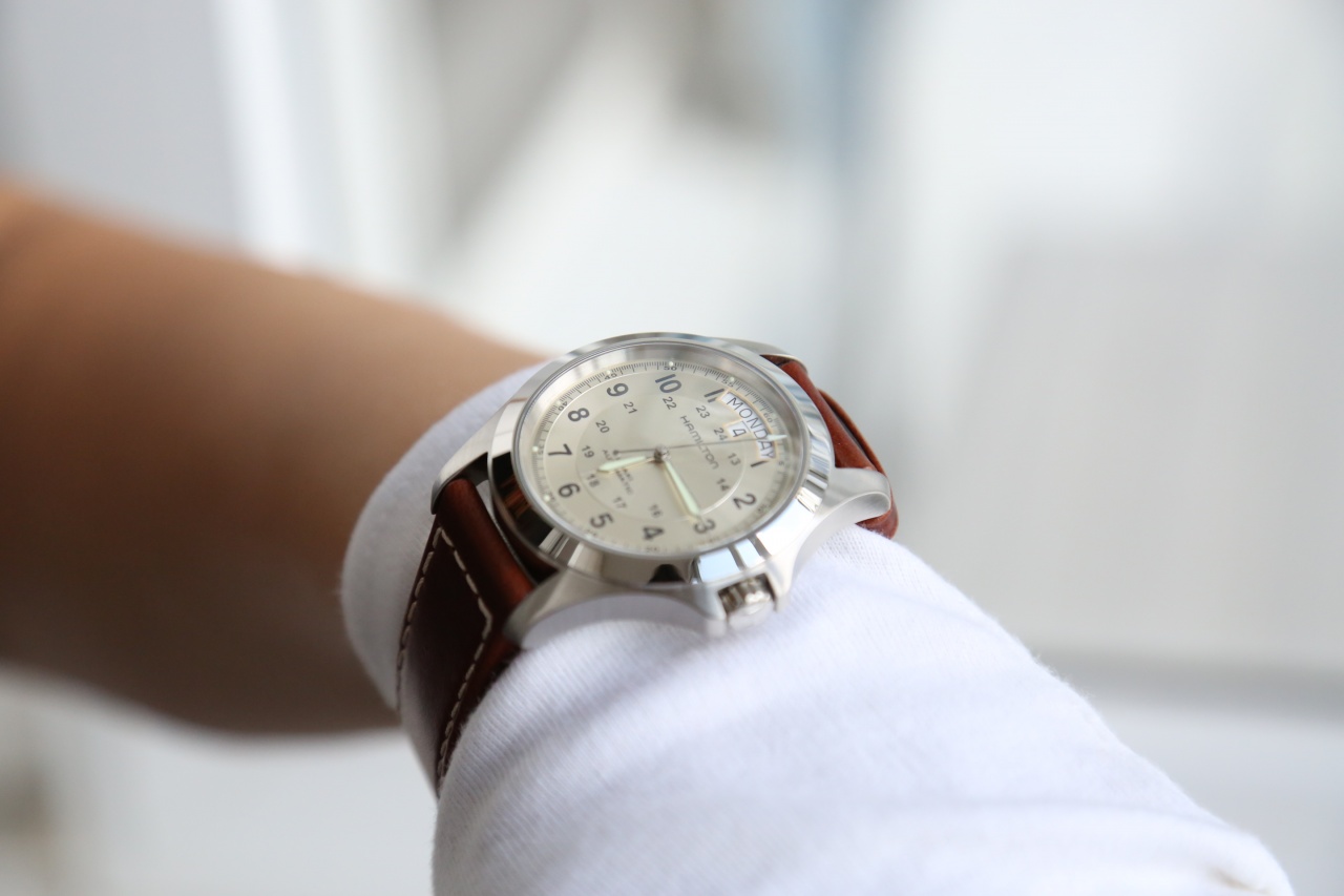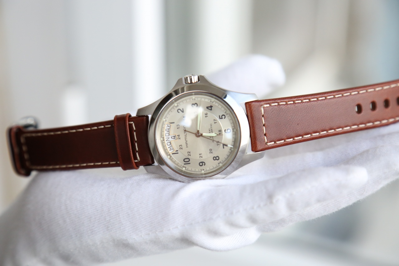 Khaki King – традиционные часы Hamilton в стиле милитари, которым придан налет шика. Их массивность и прочность завуалированы за счет элегантности корпуса из матовой стали и осовремененного циферблата. Измерительная шкала имеет поминутную градуировку; часы могут измеряться либо по 12-часовой, либо 24-часовой системе. В положении «12 часов» расположен удобочитаемый индикатор даты и дня недели.