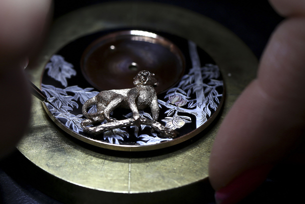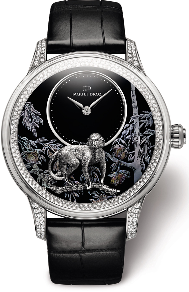 В модели Petite Heure Minute Relief Monkey эффектно сочетаются лак и перламутр. На фоне искусно выполненной листвы персикового дерева на ветке сидит вырезанная из золота обезьяна. Эти часы, образец высшего мастерства и безупречного стиля, представлены в двух версиях: в корпусе из розового золота и в корпусе из белого золота, инкрустированном бриллиантами. Ротор из золота с гравировкой и патиной и черного оникса прекрасно вписывается в затейливую композицию. Черный оникс ценится мастерами Дома Jaquet Droz за глубокий и одновременно сияющий цвет. Таинственная и чарующая красота этого камня придает часам обворожительную элегантность. Эти циферблаты-полотна покрыты специально разработанным стеклом выпуклой формы с особым креплением к корпусу.