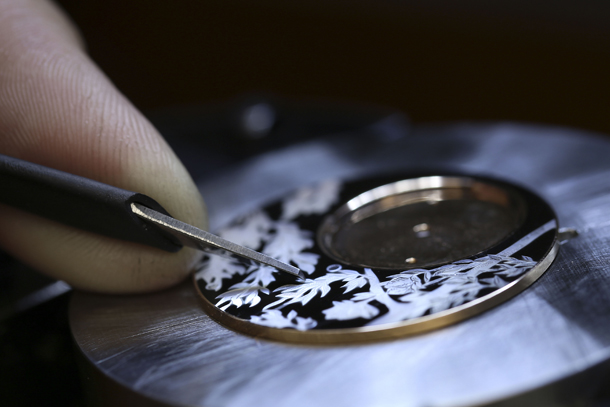 Специалисты Les Ateliers d’Art с многолетним опытом виртуозно владеют искусством живописи на циферблате. Выполненный в технике горячей эмали циферблат цвета слоновой кости со смещенным в сторону метки «12 часов» счетчиком часов и минут послужил идеальным фоном для красочного филигранного рисунка. На часах Petite Heure Minute Monkey обезьяна идет по ветке и словно готовится сорвать персик. Картина поражает не только своей тонкой красотой, но и невероятной реалистичностью.