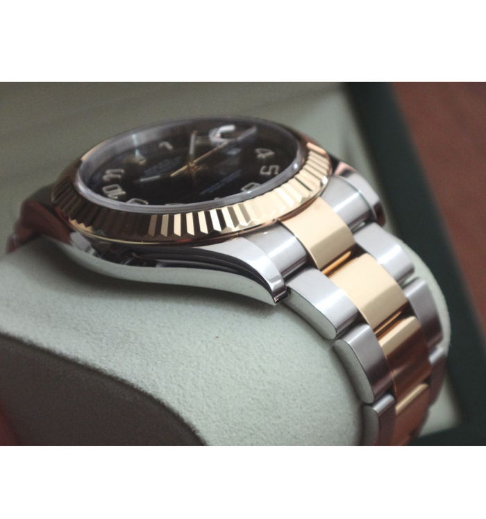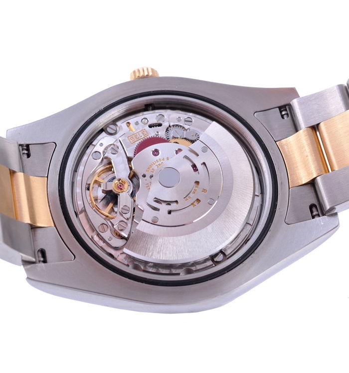 КОРПУС: сталь, полированный; безель из золота 18k, с крупной насечкой; сапфировое стекло с увеличительной линзой над окном указателя даты; завинчивающаяся заводная головка; закручивающаяся задняя крышка