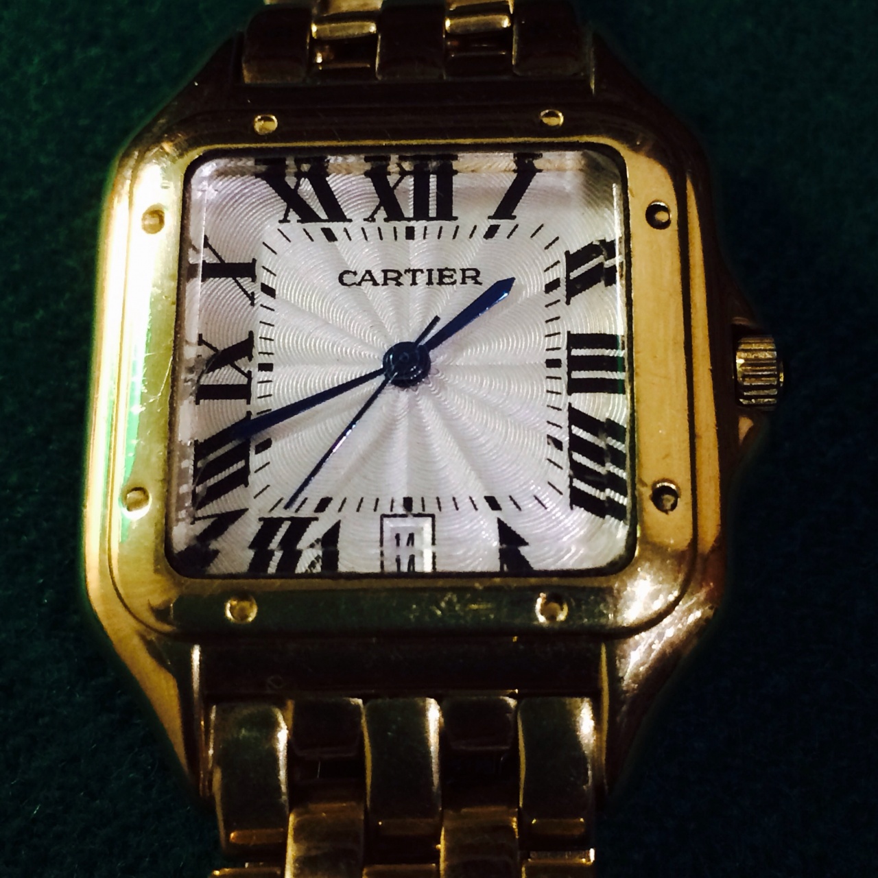 Доброго дня Всем! Подскажите кто знает , где и когда делались копии таких часов из золота ? Данный экземпляр приобрел в 2004 году у одного не бедного человека. Часы были в грустном состоянии! Пришлось провести работу, заменили циферблат со стрелками , изготовили стекло с гранью, искал родную заводную головку Но увы ! В Перми такой не найти! Часы хоть и копия соответствуют весу , золото , проверено! Большое отличие в застежке, это не вопрос!!! Крышка задняя без номера и с фальш болтами ! Родная машинка я так понимаю Швейцария хоть и не картье ! Ее пришлось пока убрать так как дата не совпадала с окошком!