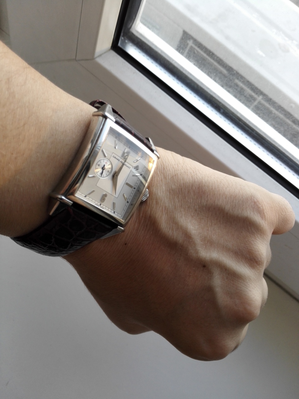 сертифицированный хронометр, вынесенная малая секундная стрелка, малая дата между часов и двумя, циферблат выполнен из серебра, стрелки и метки из белого золота
