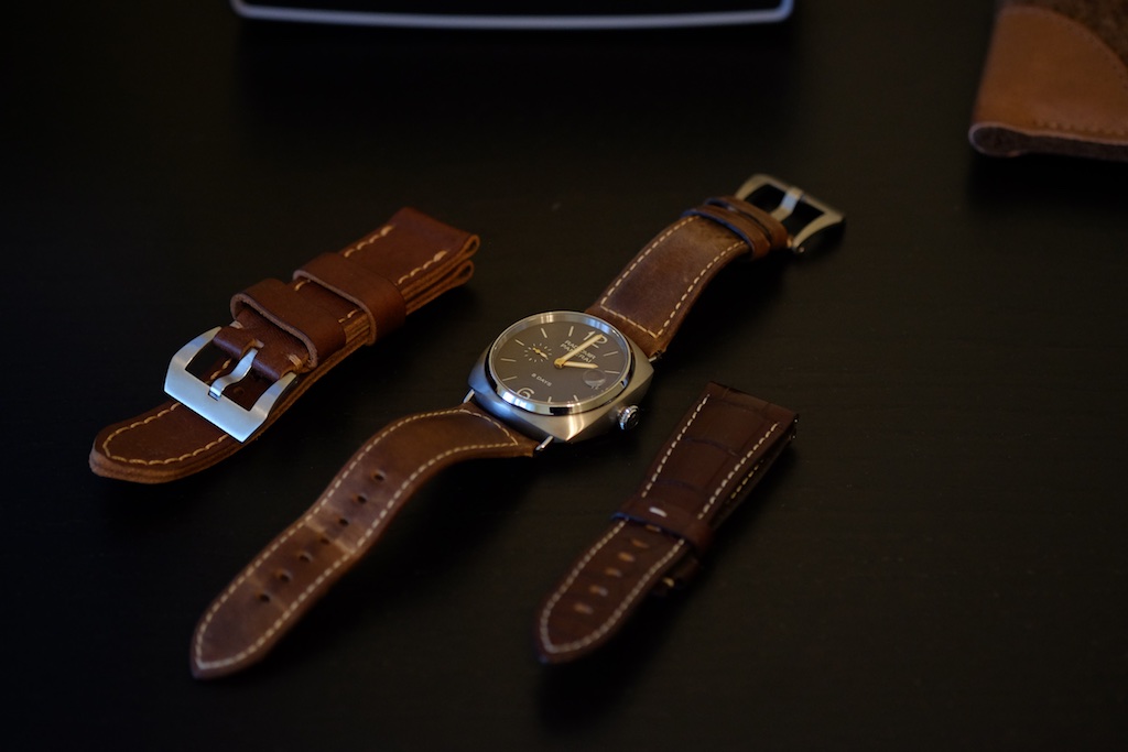 В комплекте три ремня. Оригинальный крокодил коричневого цвета с прострочкой, оригинальный теленок Assolutamente 27/22 и ремень Andystraps 27/27