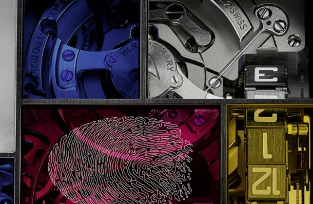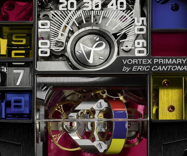 Часы Hautlence Vortex Primary - это нечто совершенно новое в мире часового искусства. Они интересные, странные и эксцентричные. Выдающийся плод сотрудничества между компанией Hautlence и французским экс-футболистом Эриком Кантоном. Элементы внешнего вида модели напоминают яркие геометрические картины Мондриана, мастера неопластицизма. Часы имеют 19 различных стеклянных панелей (сапфир, рубин и синяя шпинель), передающих стиль витража. Он прекрасно смотрится в часах и демонстрирует богатый визуальный опыт компании.