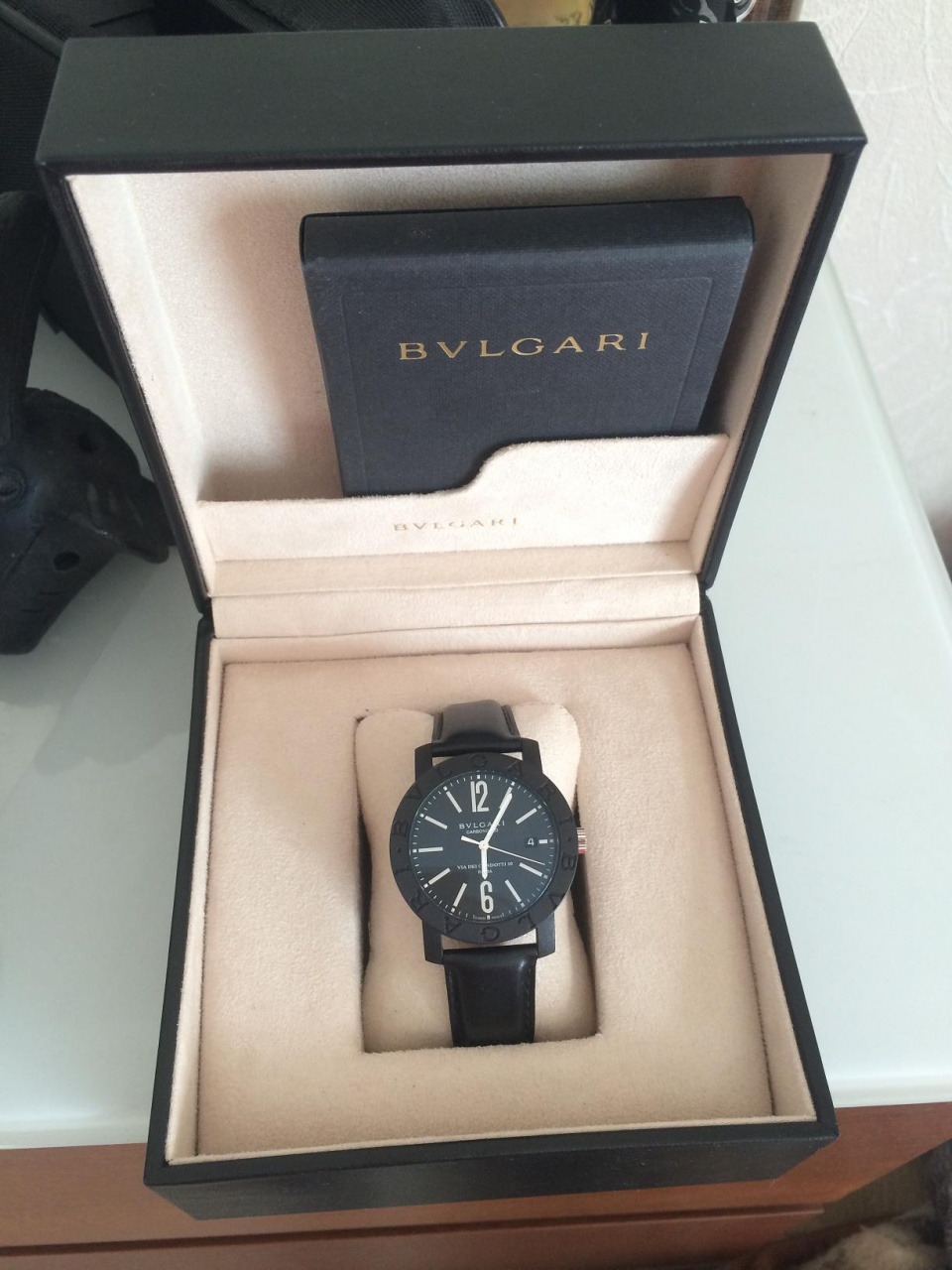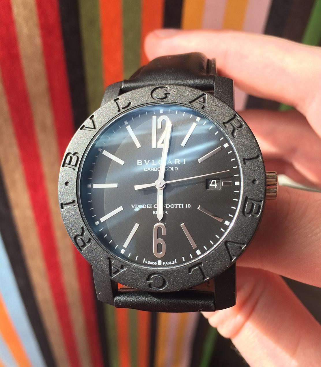 Продам ювелирные часы юбилейной серии. Коллекция BVLGARI BVLGARI, модель Carbongold Via Dei Condotti 10 Roma. Спафировое стекло с дорогим просветлением, дата, запас хода двое суток, анкерный механизм подзаводки. Полный оригинальный комплект: брошюры, сертификат, коробка, капсула, замшевый чехол для хранения в дороге. Состояние идеальное, сколов потёртостей, царапин нет. Одевались на процедурные мероприятия, в общей сложности на руке носил не более 20дн. Куплены в Нью Йорке, все чеки есть, использовались строго в соответствии с инструкцией (настройка даты).