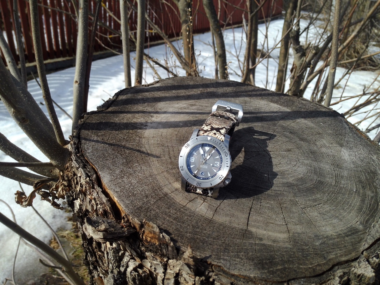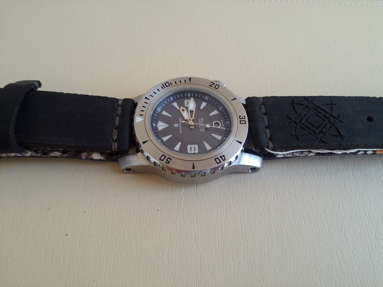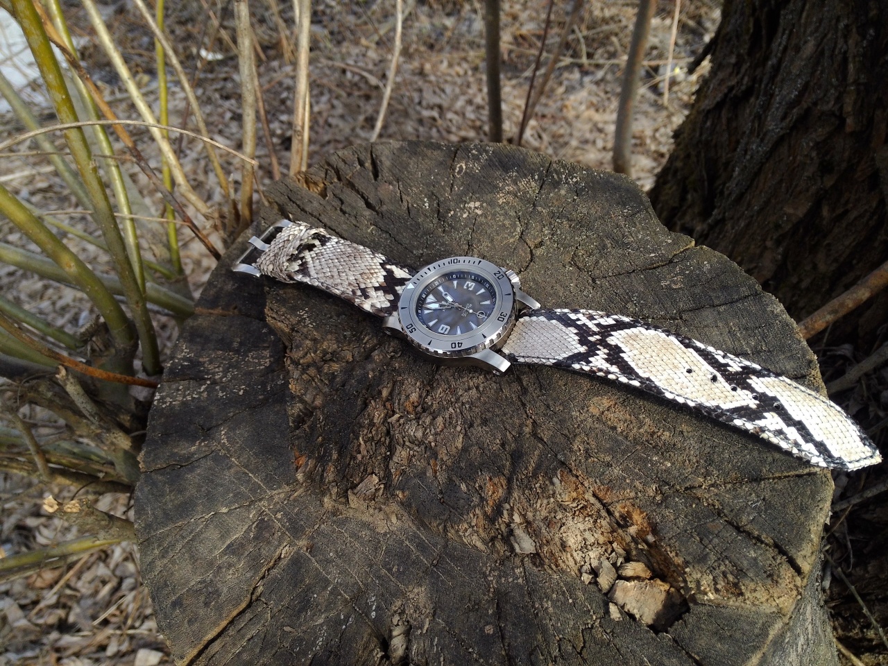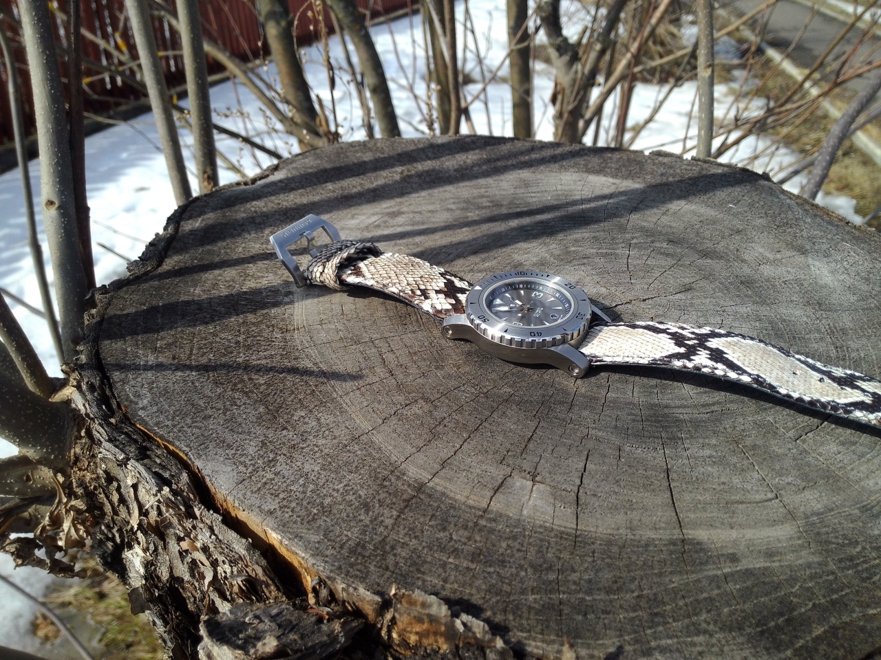 В придачу к часам идут совершенно новые, дизайнерские экслюзивчики (3штуки), один ремшок из кожи питона ручной работы, а также родной ремешок (который находится в еще очень приличном состоянии)...