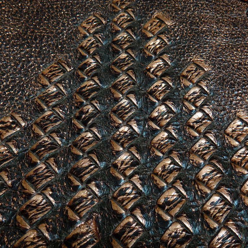 Уникальная, харизматичная фактура. Насыщенный, играющий на свету золотисто-медный цвет, с винтажным эффектом состаренности и почернения по коже.