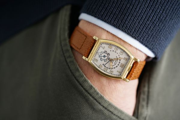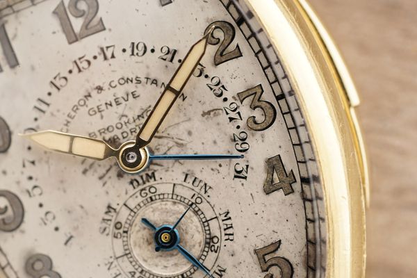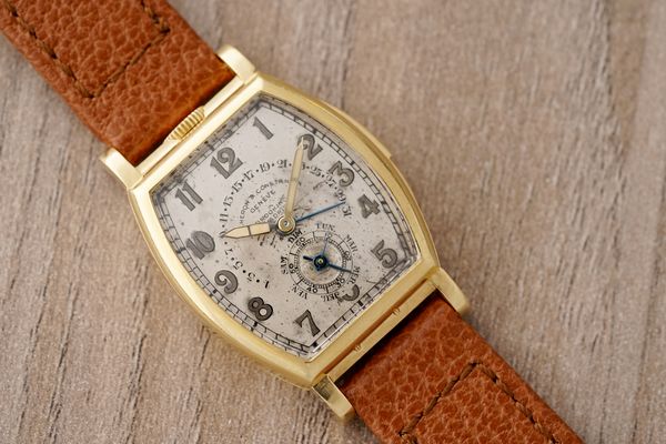 In December 1935, the renowned Geneva-based watchmaker Vacheron Constantin received a letter from Madrid-based retailer Brooking who, on behalf of a client, wished to commission a watch. The order, highly unusual at the time, combined a large yellow gold tonneau case, a crown at twelve, a minute repeater with the lowest possible notes, a repeater trigger on the right side of the case, day, retrograde date, and his initials in blue enamel on the caseback. Two dials, one with enamelled black Breguet numerals and the other with radium numerals, both with all twelve numerals, and 6 straps which are easily changeable.
