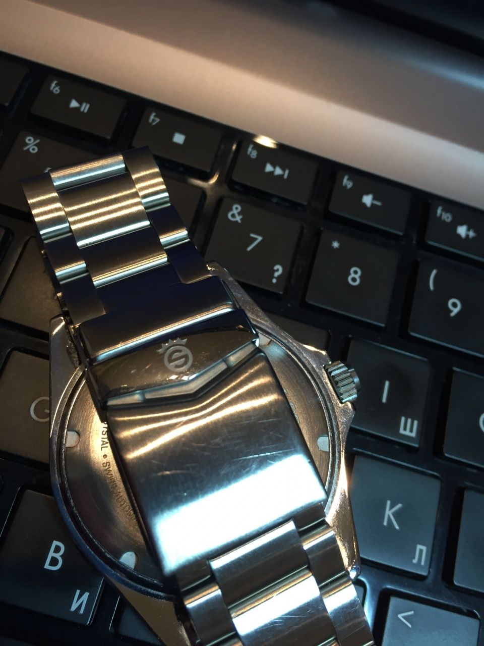 Не плавал, не бился. Состояние прекрасное, следы ношения присутствуют, мелкие царапинки на браслете и на застежке побольше. Стекло и лупа чистое, без каких либо царапин. Если чего то не видно на прилагаемых снимках, могу сделать дополнительные фотографии. Комплект полный, браслет уменьшен на руку 18,5 дополнительные звенья в наличии.