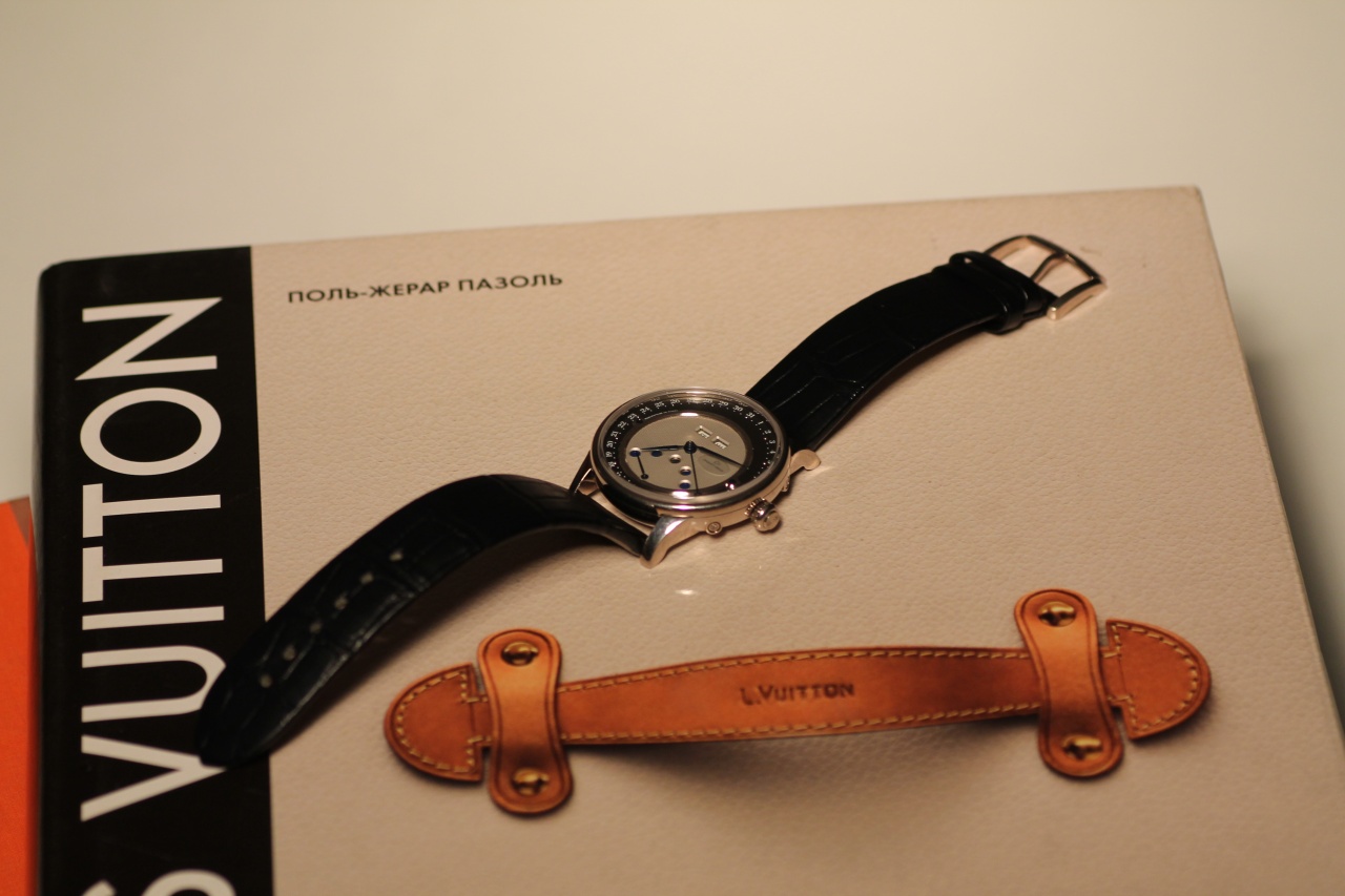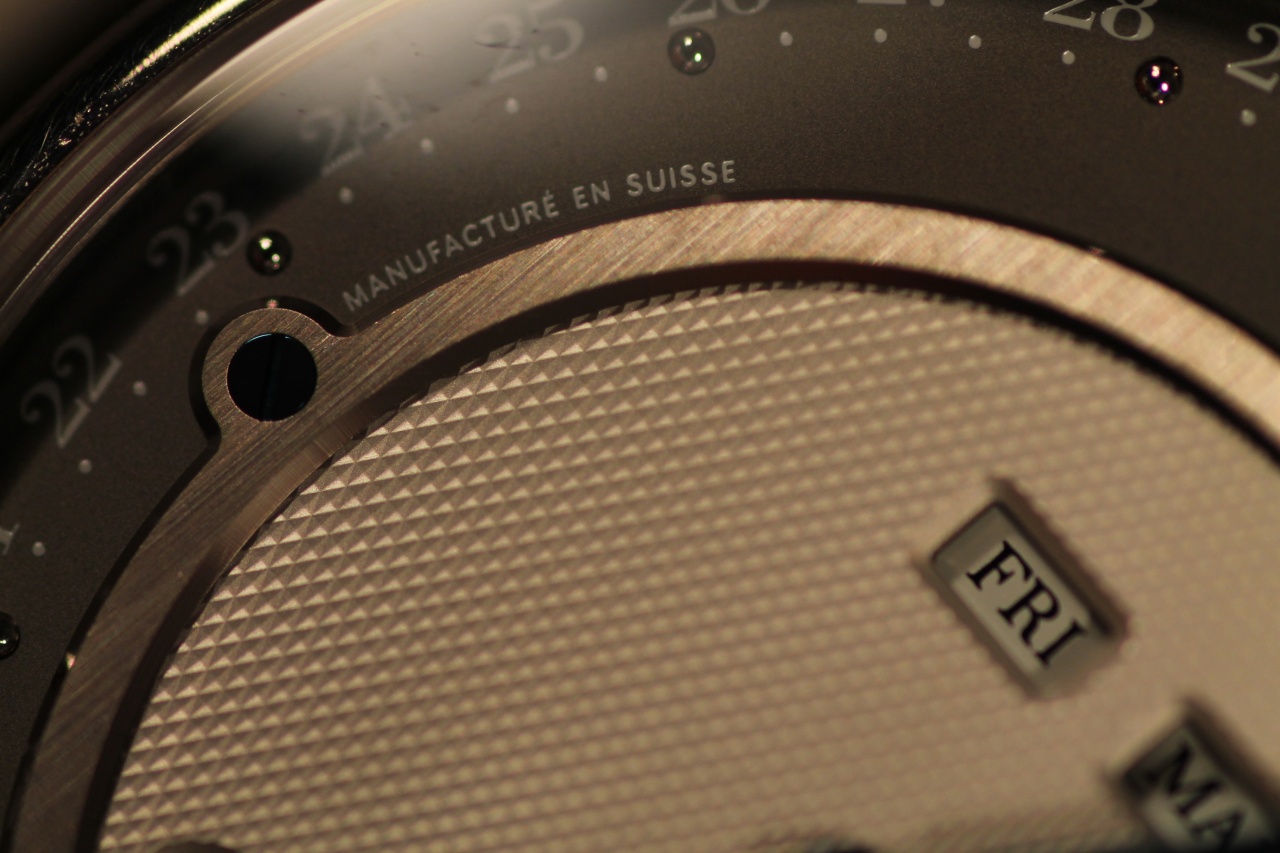Кроме того, часы обладают полным набором календарных функций: окошки в верхней части циферблата отображают день недели и месяц, а дополнительная стрелка с лунным полумесяцем на конце указывает дату. Частота 28 800 полуколебаний в час, 28 камней. Корпус белого золота (18 карат), 40,5 мм. Циферблат: с серебристым гильоше. Водонепроницаемость 30 м. Запас хода около 68 часов. Стекло - сапфир. Браслет кожаный, коричневого цвета. Застежка белое золота.