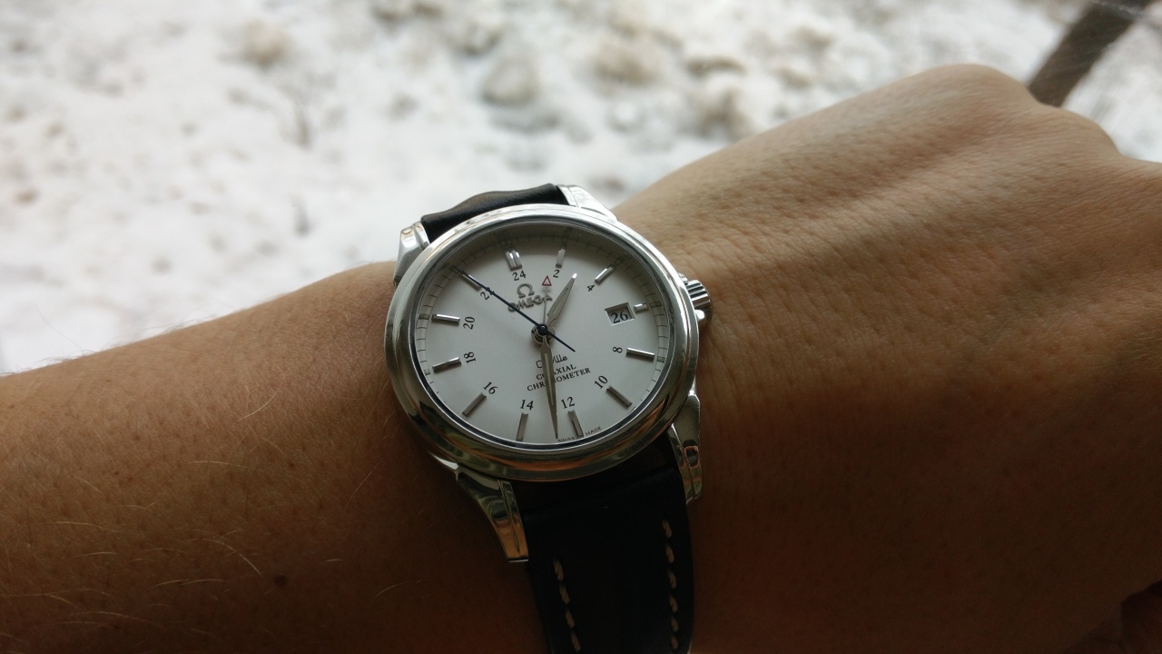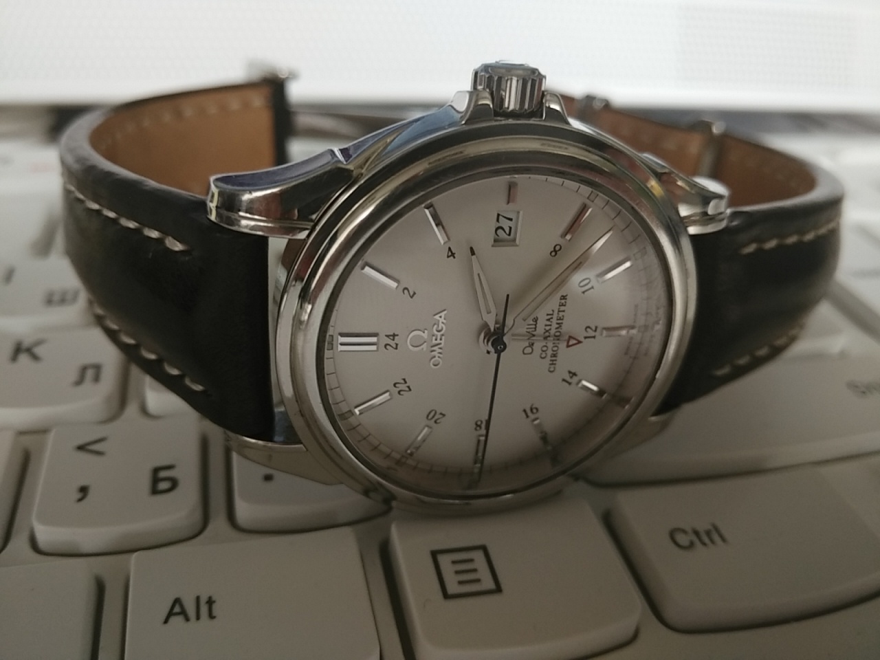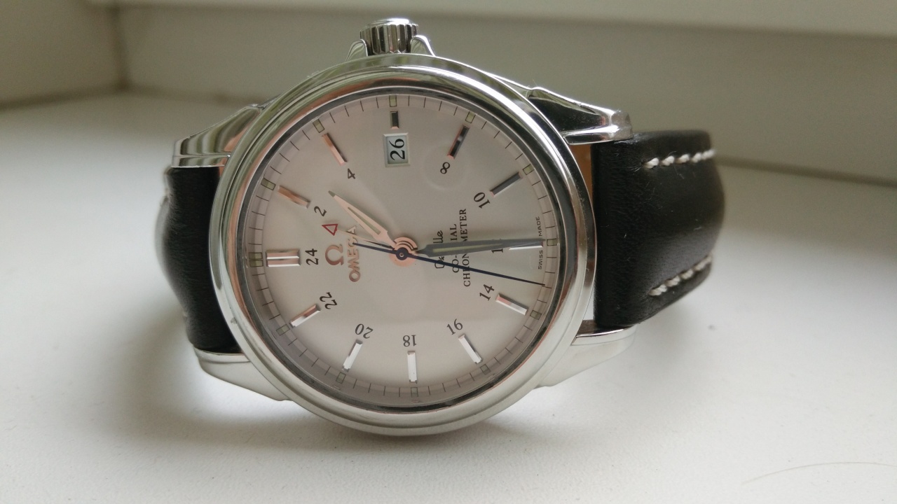Продаю одни из своих самых любимых и универсальных часов. Состояние прекрасное. Ремень неоригинальный Rios с раскладывающейся клипсой, он мне нравится даже больше чем оригинальный, он толще и гораздо лучше подходит этим часам. В отличии от серии DeVille Prestige мои часы не являются 100% костюмниками, они будут прекрасно смотреться как с джинсами, так и с шортами. Замечательный молочный цвет циферблата прекрасно сочетается как раз с костюмами и легко комбинируется с разного цвета ремнями. Ещё, на мой взгляд, у них самый красивый шрифт надписей и цифр даты, нигде такого красивого не встречал однозначно. Скажу сразу: эти часы намного удобней на руке чем AquaTerra за счёт более обтекаемой и удобной, здесь красивей стрелки, есть замечательная стрелка GMT и тонкая, как волос, секундная стрелка. Метки и логотип полированные и накладные, а не рисованные, как на многих других Омегах. И моё мнение, что эти часы, самые универсальные из всех Omega, они смотрятся с джинсами и свитером на порядок лучше, чем, например, Seamaster с костюмами. Утверждаю это, так как имею в наличие почти все серии часов Omega и несколько Breitling. Водонепроницаемость часов 100 метров, можно не бояться попадания влаги внутрь корпуса. Размер 39мм, идеален для запястья от 16 до 18мм, толщина всего 10мм, влезают под любой манжет рубашки, даже под достаточно узкий. В сравнении с часами 40-41мм маленькими совсем не кажутся, а, например, если сравнить с Breitling Chronomat 39mm выглядят гораздо больше, кстати как и в сравнении в Planet Ocean 42mm, так как нет широкого безеля и площадь стекла гораздо больше. Из комплекта есть только коробка без подушки. Проверить можно в любом сервисе. Кстати ход +-2 сек. в сутки, что очень достойный показатель для хронометра. Особой задачи продать во что бы то не стало не преследую, причина продажи: есть очень много хороших и разных часов и от каких-то можно отказаться. Искушать меня фразами типа: "Куплю сегодня за 70 тысяч" не надо. Таких часов, в таком как у меня состоянии, дешевле моей цены нет. Торг чисто символический и только при осмотре реальному покупателю. По соотношению "престиж марки + характеристики + узнаваемость" за такие деньги ничего лучше не найти, проверено мной не раз. Не продадутся, оставлю себе, так как расставаться с часами откровенно жаль. Если продадутся, точно буду по ним скучать. Сейчас часы на ремне (чёрный с белой строчкой) с ним и продаются.