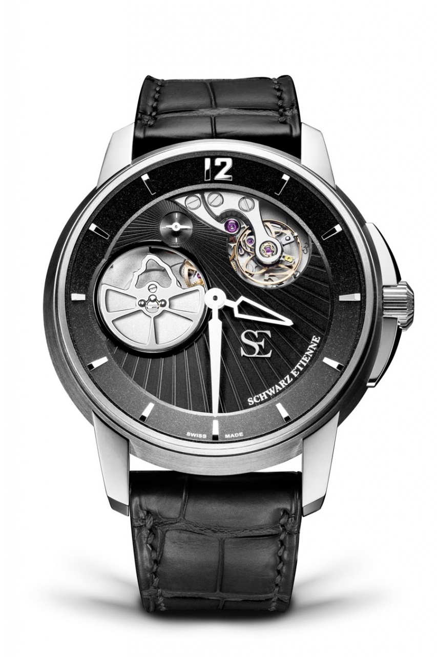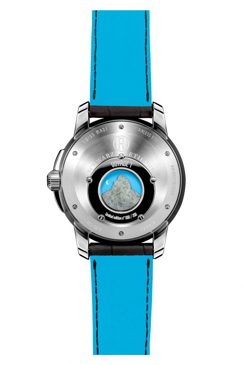 Новая лимитированная модель Roswell Voyage от швейцарской часовой компании Schwarz Etienne имеет круглый полированный корпус, изготовленный из нержавеющей стали, диаметром 45,0 мм, толщиной 11,3 мм, водонепроницаемый до 50 метров. На торце защищенной рифленой заводной головки, расположенной на 3 часах, выгравирован логотип бренда Schwarz Etienne. На завинчивающейся задней крышке имеется круглое окошко в которое вставлен каменный силуэт альпийской горы Маттерхорн. Сапфировое стекло защищает черный циферблат с лучистым гильошированием, с накладными родированными часовыми индексами и стрелками. На 9 часах размещена крупная круглая апертура, сквозь которую просматривается микро-ротор автоподзавода, а между 1 и 2 часами - круглая апертура, сквозь которую просматривается балансовое колесо. Модель оснащена мануфактурным швейцарским автоматическим механизмом Schwarz Etienne ISE 100.00 (Voyage 1), с децентрализованным микро-ротором, четырехдневным запасом хода, функциями индикации часов, минут (посредством соответствующих центральных стрелок) и секунд (на соответствующем малом боковом циферблате, расположенном на 11 часах).