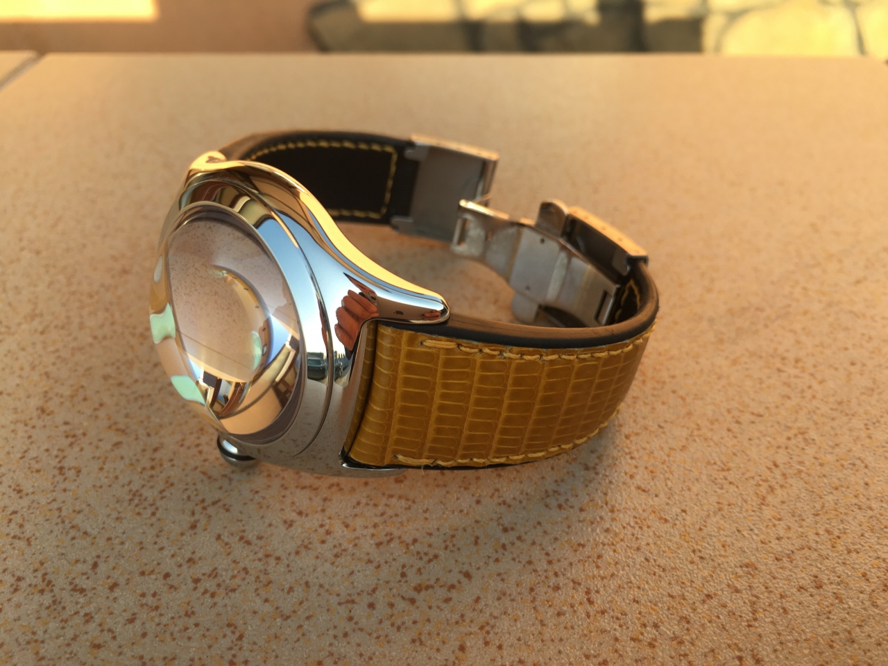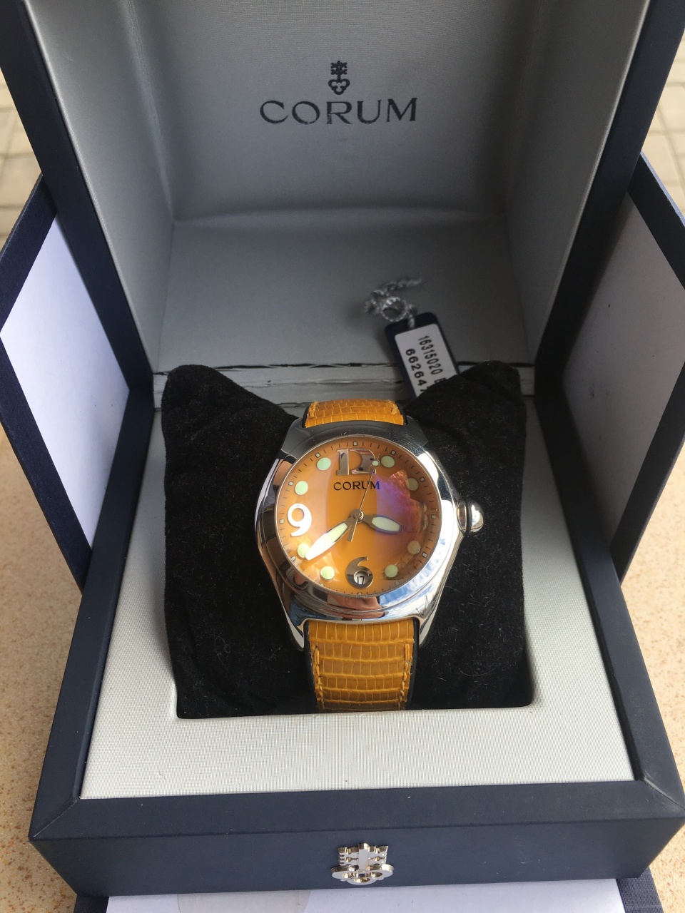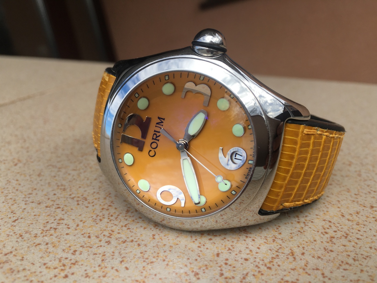 CORUM BUBBLE с циферблатом темно-желтого цвета.