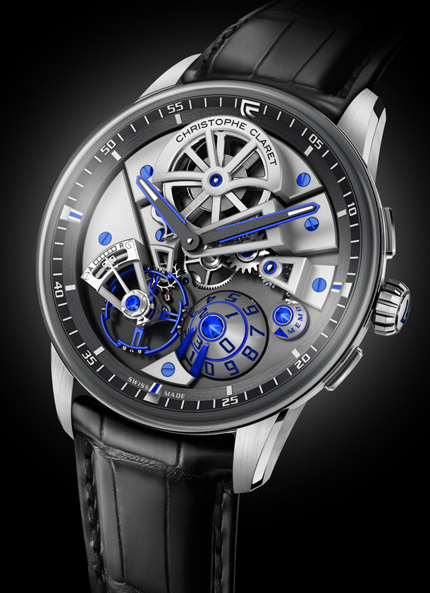 Перекликаясь с объемным указателем даты, сапфировый или рубиновый акцент появляется на циферблате между отметками «3 часа» и «4 часа». Компания Christophe Claret, которая никогда не скупится на создание оригинальных усложнений, будоражащих воображение истинных ценителей высокого часового искусства, представляет в этой модели еще одну совершенно новую функцию. Вдохновившись выражением «завязать узелок на память» и проникнувшись желанием помочь человеку не забывать о важном, Мануфактура создает функцию MEMO – гениальное механическое напоминание, предназначенное для забывчивых и рассеянных людей, а также для всех любителей технических гаджетов.