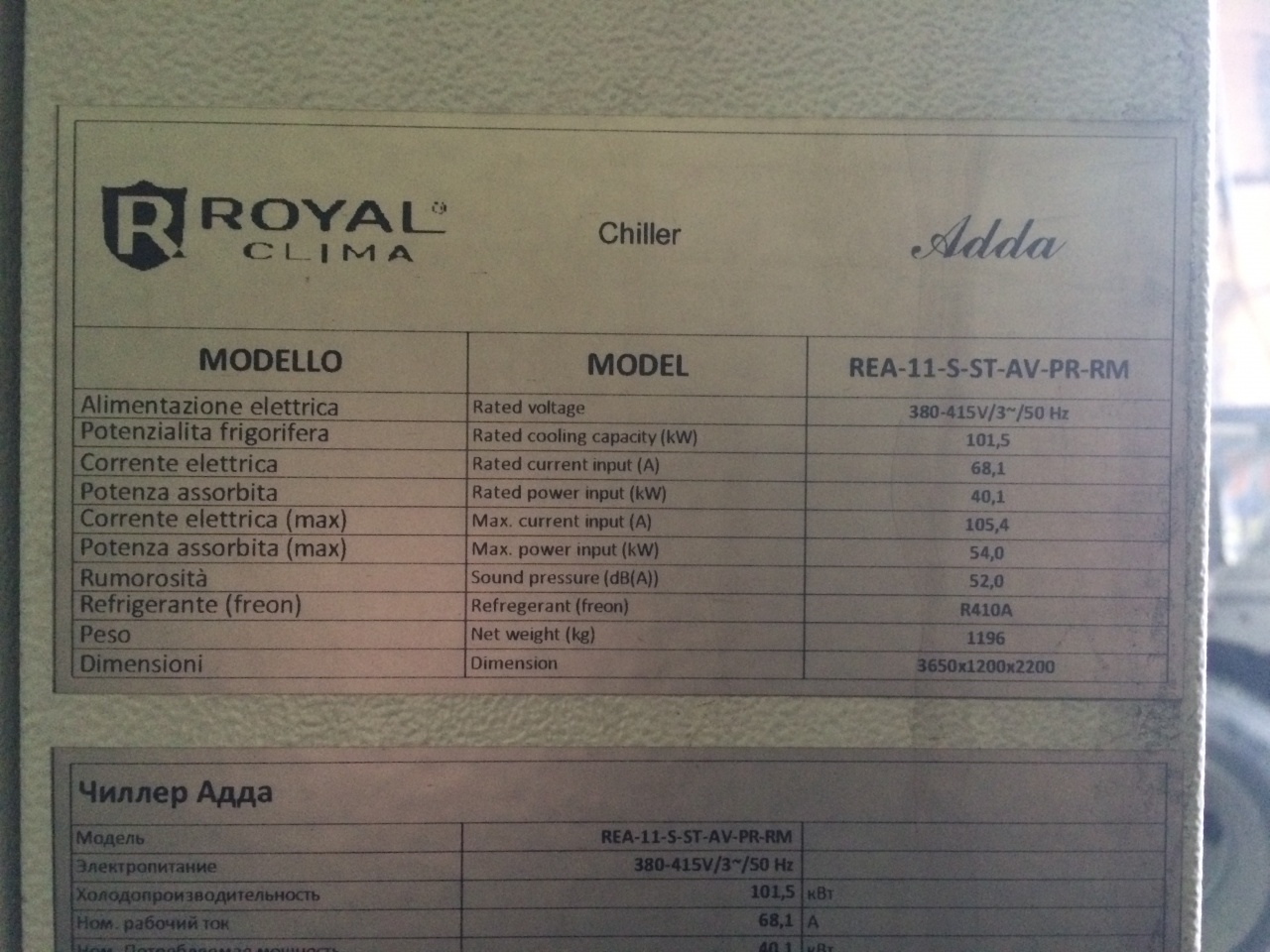 Совершенно новый Итальянский Чиллер ROYAL CLIMA модель ADDA. REA-9-S-AV-PR с воздушным охлаждениям конденсатора. Покупался на строящийся объект (Ресторан 600 кв.м) Стройка заморожена в связи с кризисом. Оборудование покупалось в 2014г. за 31500 евро. Продам с очень хорошим дисконтом, за 1 500 000р. Если далеко везти, цену скину на дорогу. Оборудование подойдет под кондиционирование офисов, торговых площадей, пунктов общественного питания. Место расположения г. Смоленск.