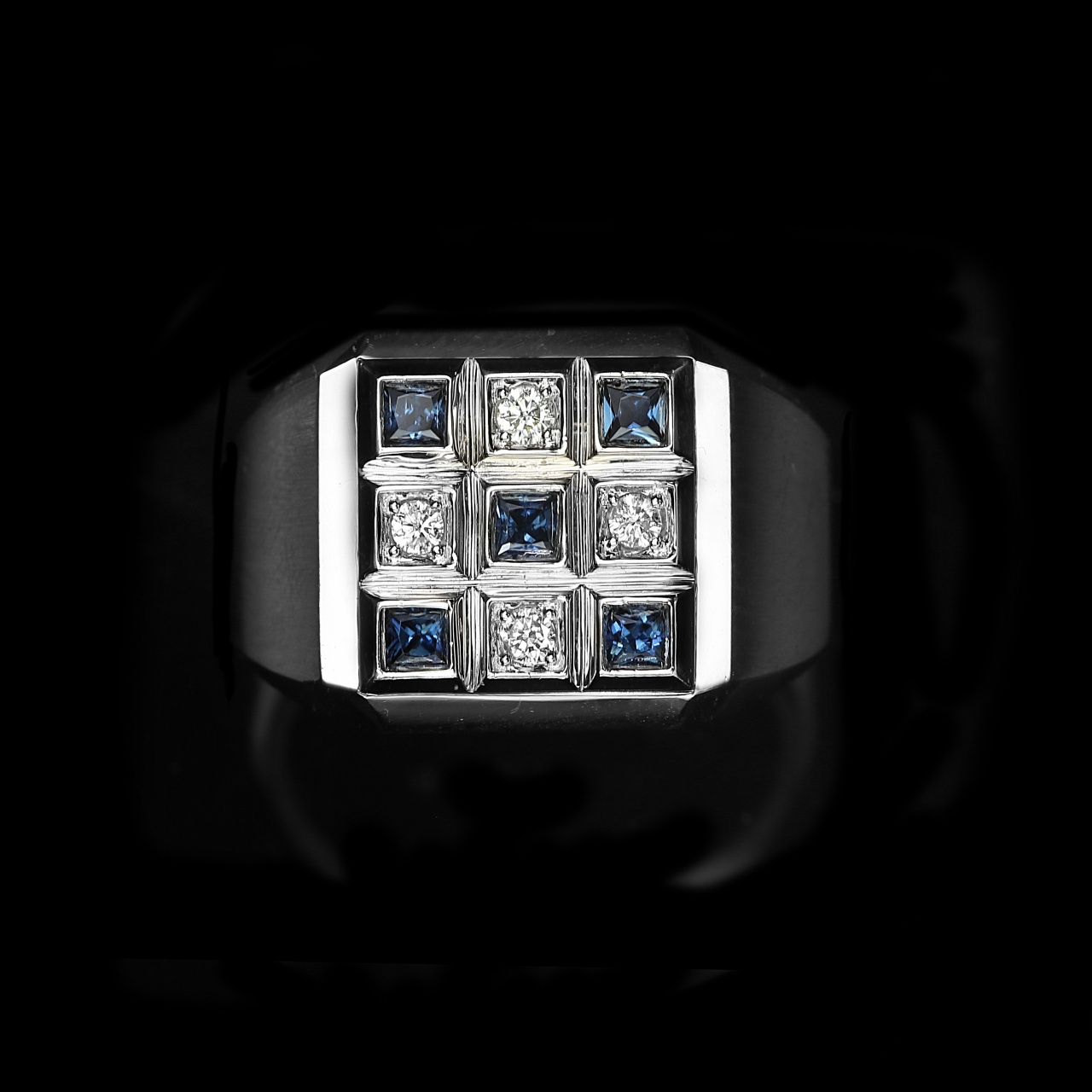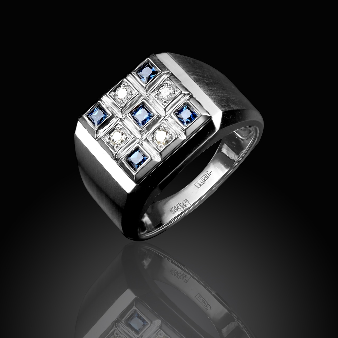 Мужской перстень из белого золота с бриллиантами 0,16 карат и сапфирами 0,5 карат