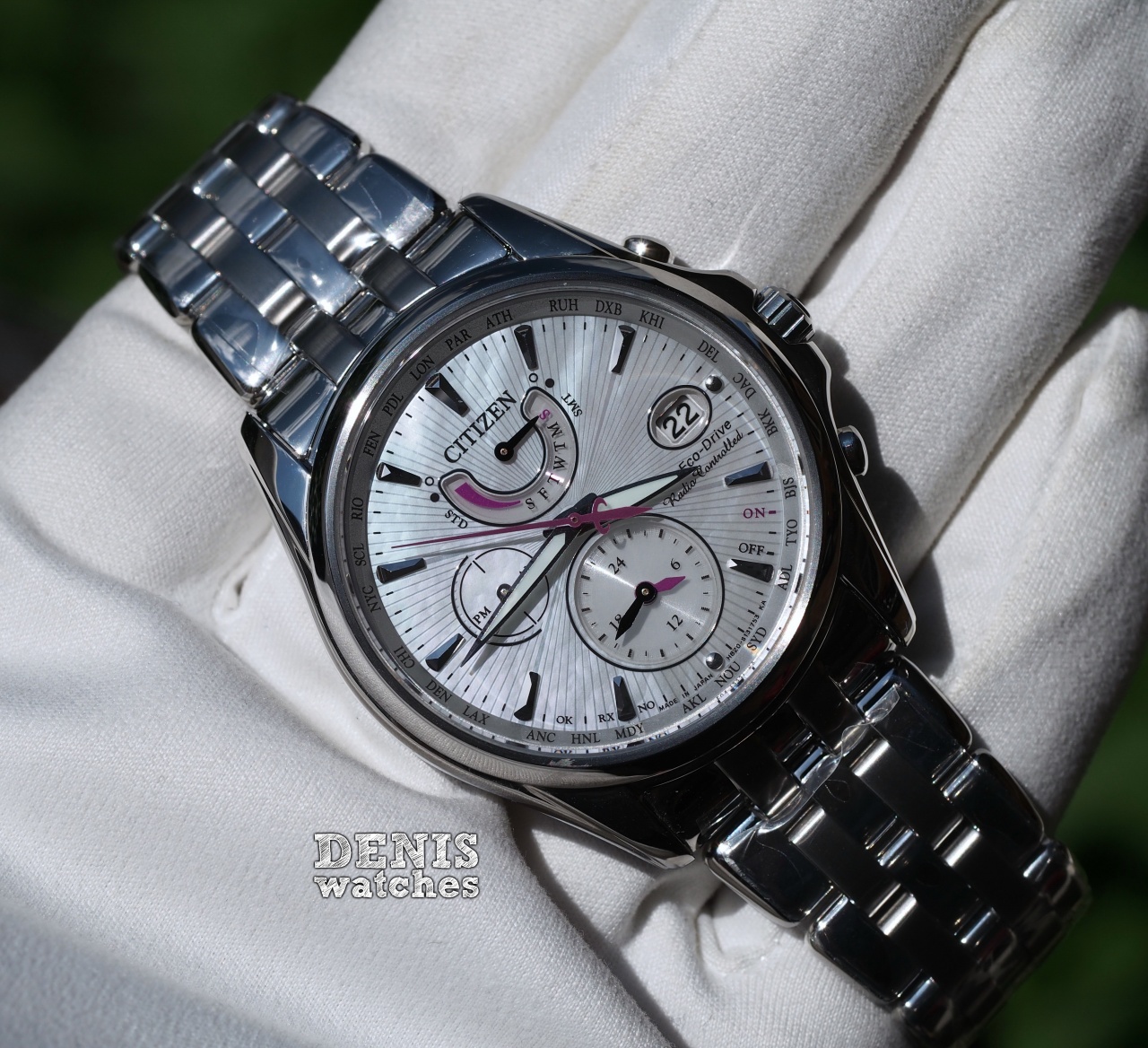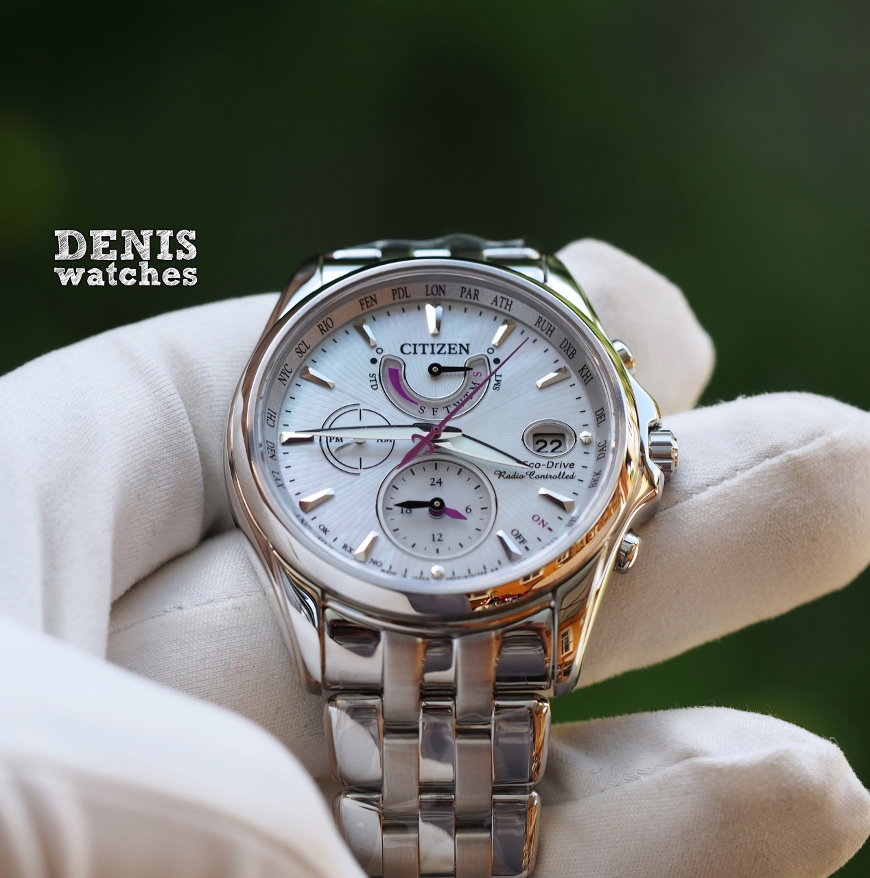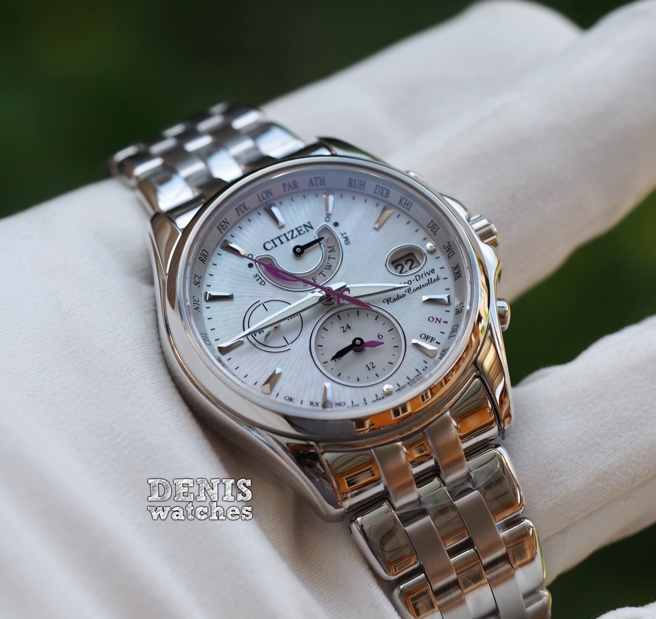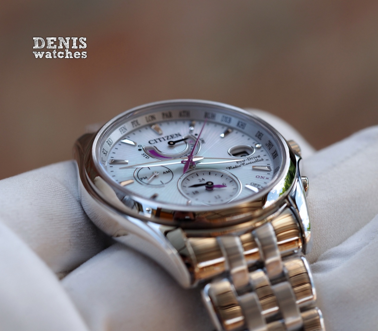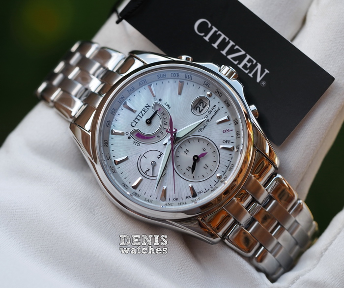 Перламутровый циферблат с небольшими фиолетовыми акцентами смотрится свежо и красиво!