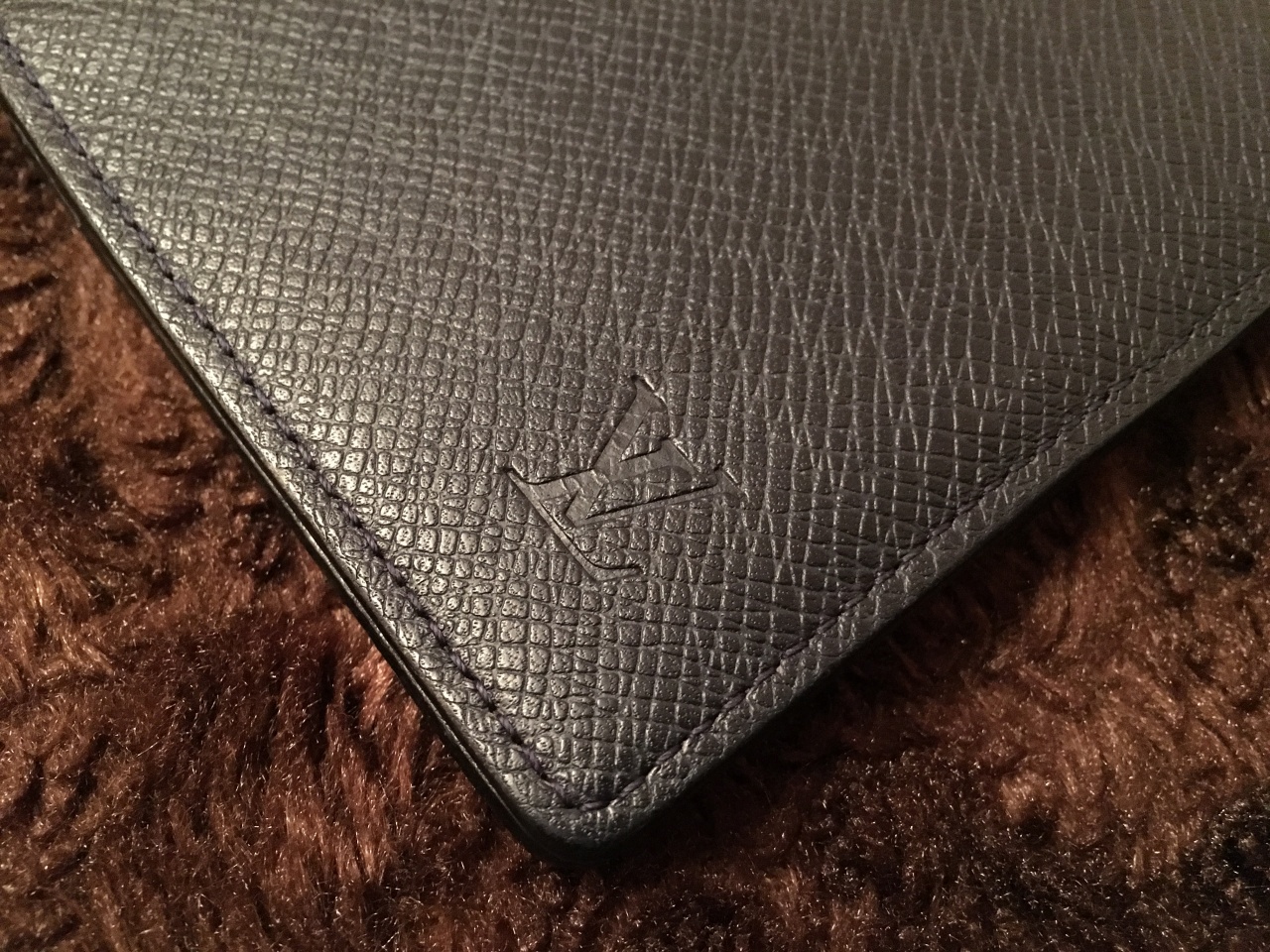 - Кожа Taiga, украшенная сдержанным тиснением логотипа LV, подкладка из зернистой кожи