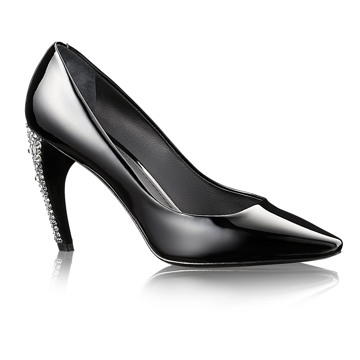 "Потрясающие туфли Black Diamonds с острым мысом из лакированной кожи теленка с графичным изогнутым каблуком, отделанным бархатистой замшей и инкрустированным ослепительными кристаллами Swarovski.