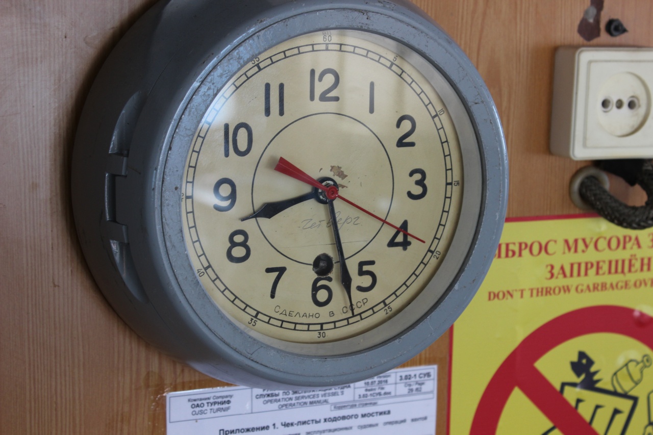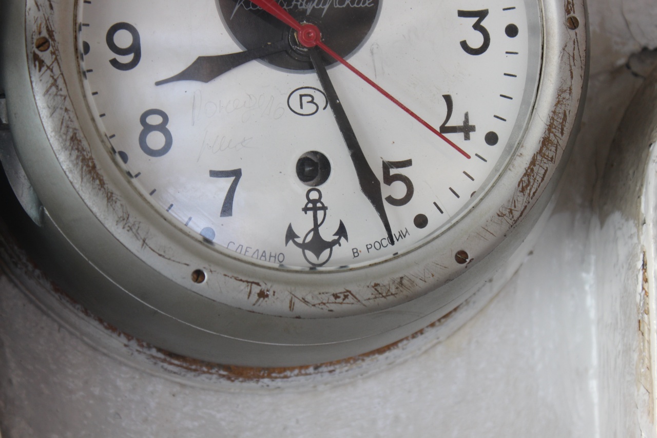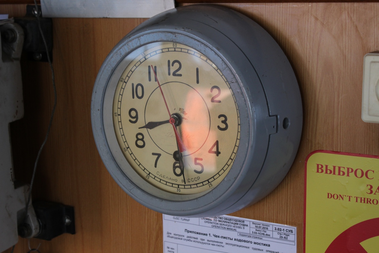 Здравствуйте.Недавно побывав на одном из БМРТ (большой морозильный рыболовецкий траулер), был приятно удивлен. На ходовом мостике обнаружились вот эти чистопольские судовые часы.На торговом флоте часы уже повсеместно кварцевые,различных брендов и т.д. Ну а т. к. рыболовный флот у нас, в основном, древний, данный пароход 1984 года, то часы сохранились с тех времен. Причем идут отлично, завода хватает на 8-9 суток.